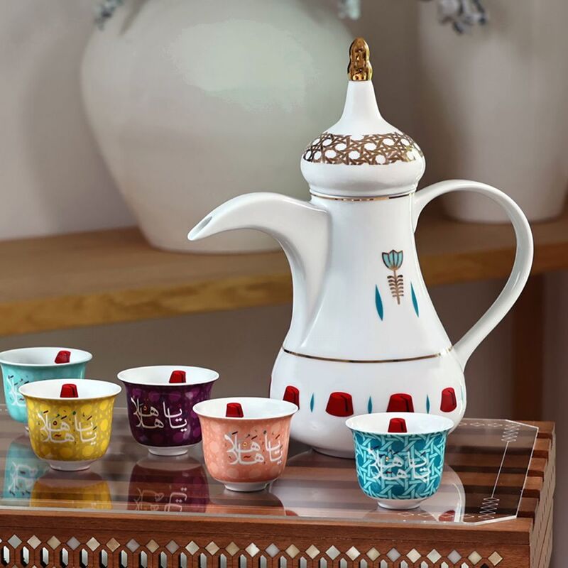 The art of Ottoman coffee making is a ritual, tradition and part of Arab hospitality that's honored in the region. Both elegant and colorful, the Khaizran Dallah features the iconic Tarboush, the famous Levantine flower, and the elegant and timeless Khaizaran pattern. With a gorgeous silhouette, this dallah blends contemporary aesthetics with traditional craftsmanship.