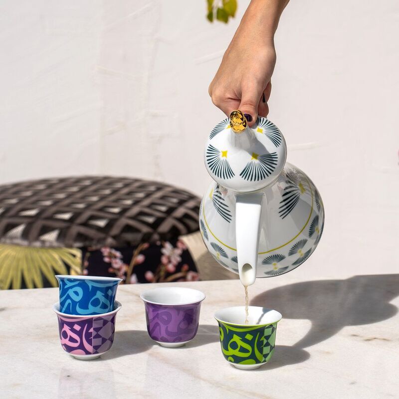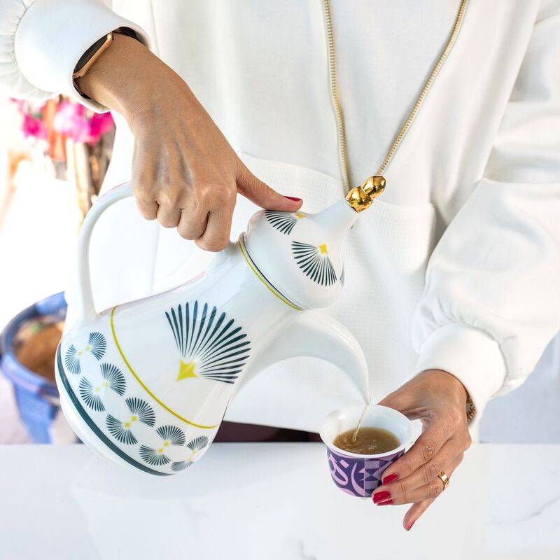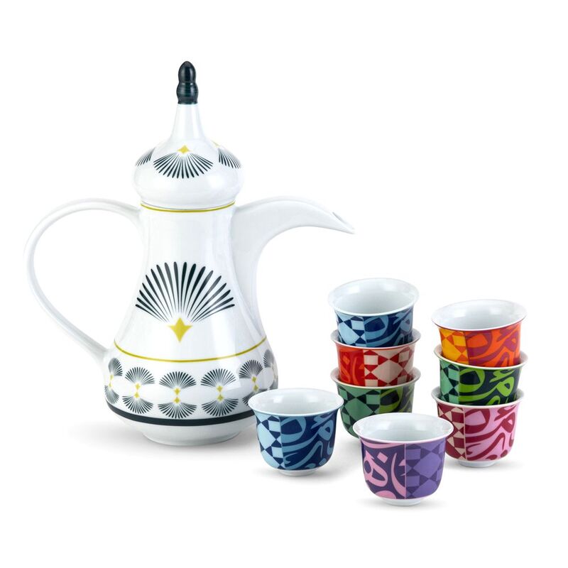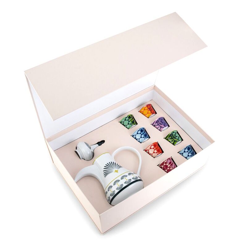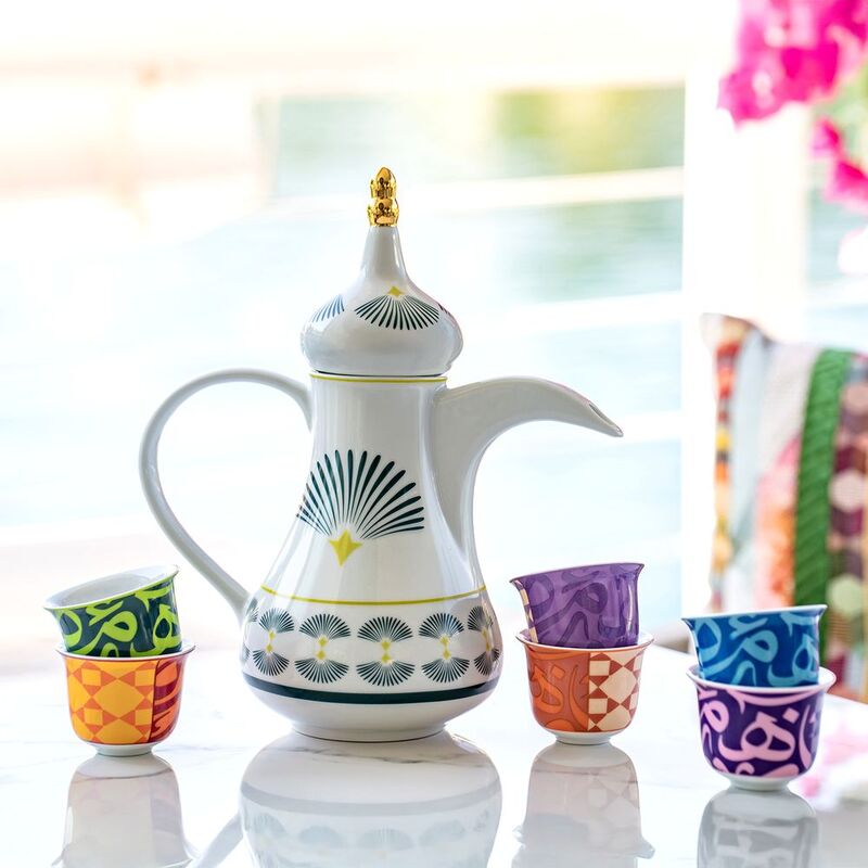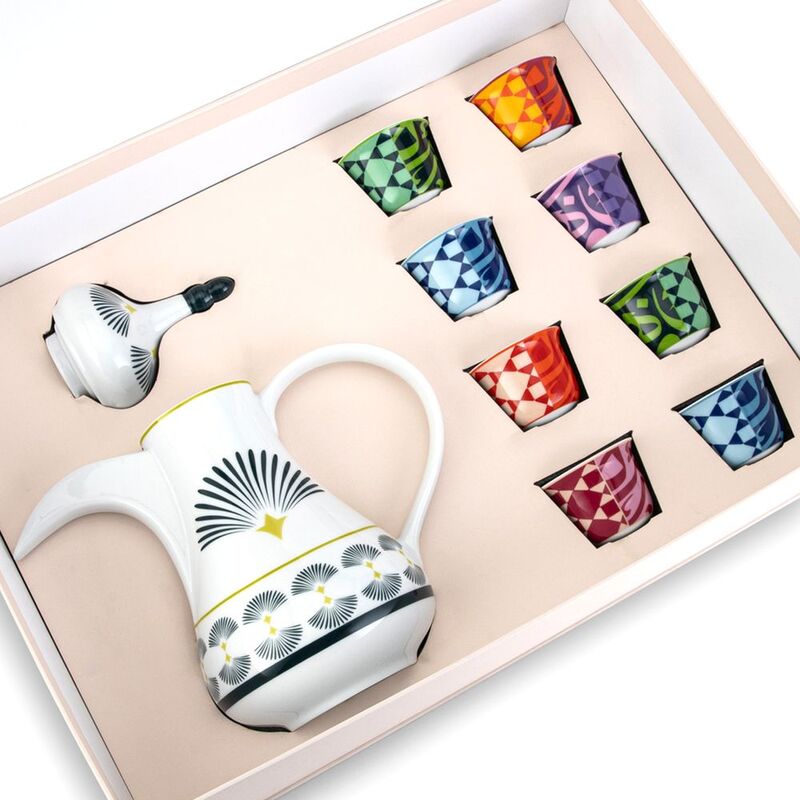Celebrate tradition with a modern twist with the Bahja Dallah & 8 Arabic Coffee Cups Gift Box. Elegantly packaged in a sisal box, this set includes a beautifully designed dallah and a vibrant mix of Arabic coffee cups, perfect for joyful gatherings. A fusion of heritage and artistry, it transforms every coffee moment into a cherished experience.