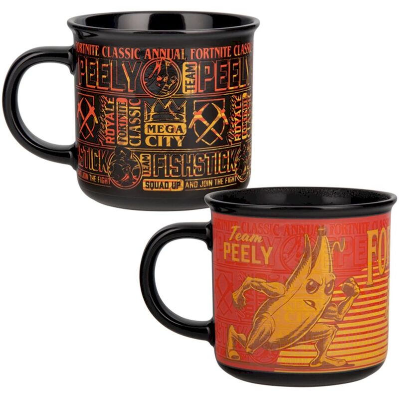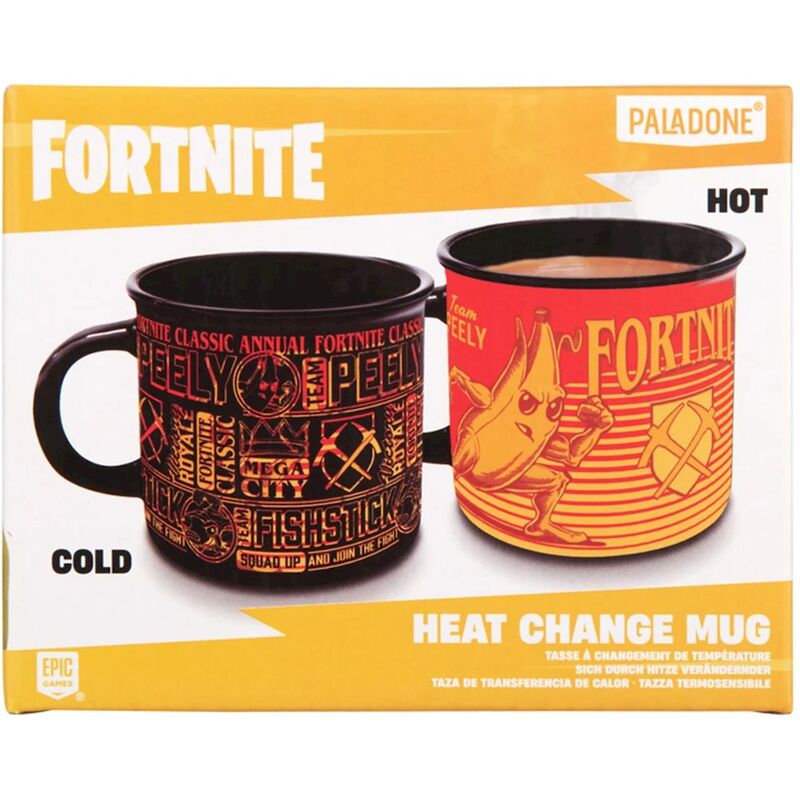 Level up your coffee breaks with this Fortnite Heat Change Mug. The 350ml (11 fl oz) ceramic mug features Peely and Fishstick locked into battle. Just add a hot drink and watch as the design transforms before your eyes. Not suitable for dishwasher or microwave use. The Fortnite Heat Change Mug is a must-have for your kitchen cupboard, perfect for your favourite tea, coffee or hot chocolate.