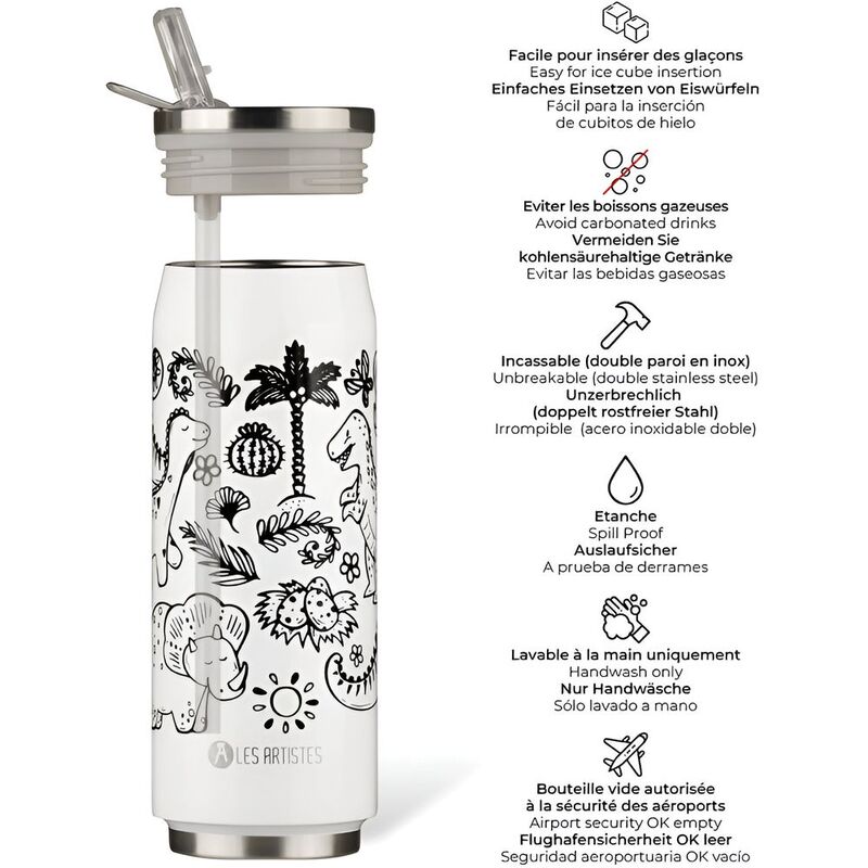 The isothermal can is an insulated flask designed as a can. Its double-wall stainless-steel technology maintain drinks hot for 5h and cold for 10h, with no impact on the drink's flavor. This colouring model comes with 6 washable felt-tip pens, so you can draw dinosaurs over and over again.