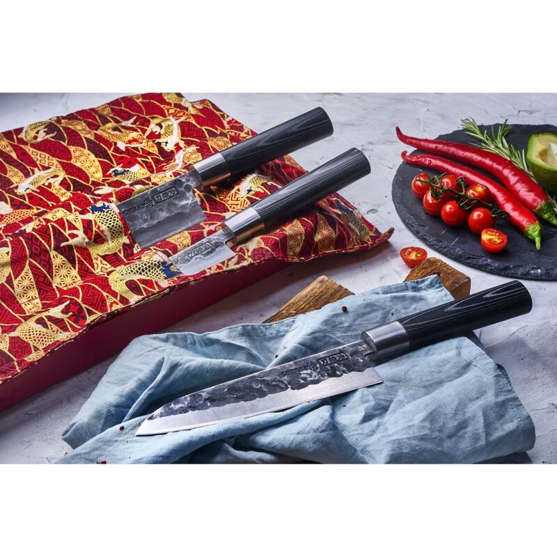 The durable Micarta handles are a classic oval shape that ensures a confident grip and comfortable high-volume use. The BLACKSMITH series comes wrapped in a Japanese decorative chef-roll packaged within an exquisite gift box.
