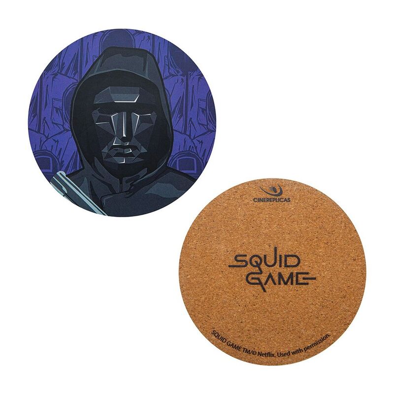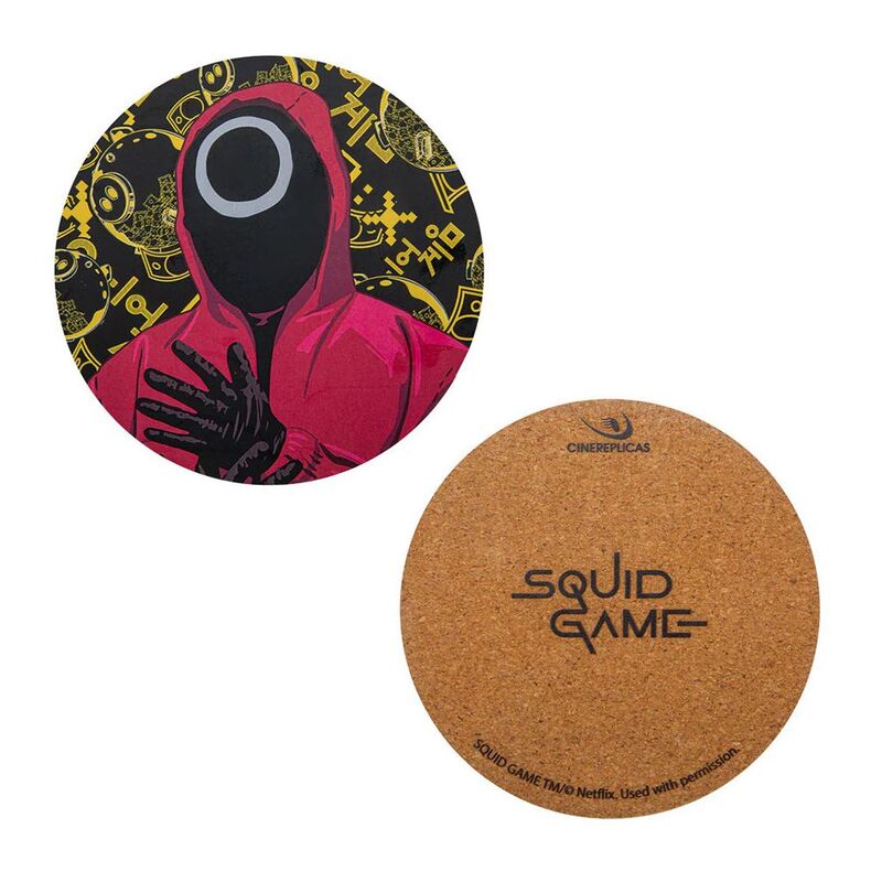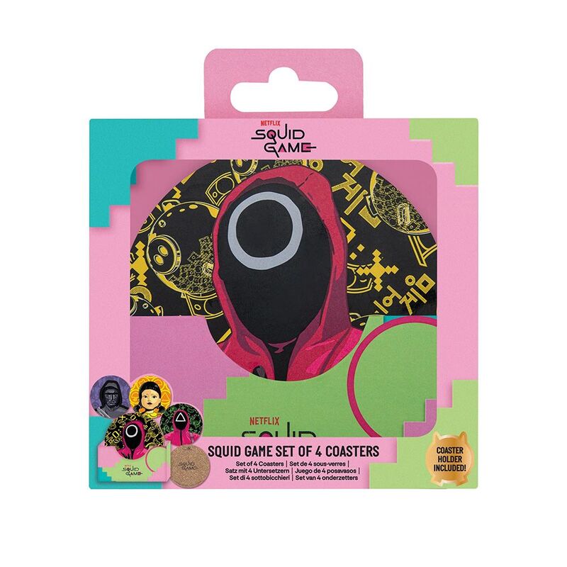 Elevate your decor with this set of 4 Squid Game coasters, and let the spirit of the series linger in your surroundings. Each coaster is adorned with the face of either Young Hee, two pink guards, or the Front Man, otherwise known as the mastermind behind the gripping games.