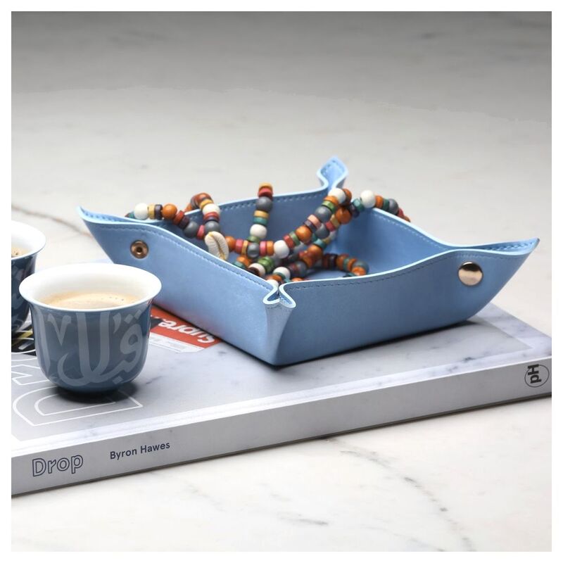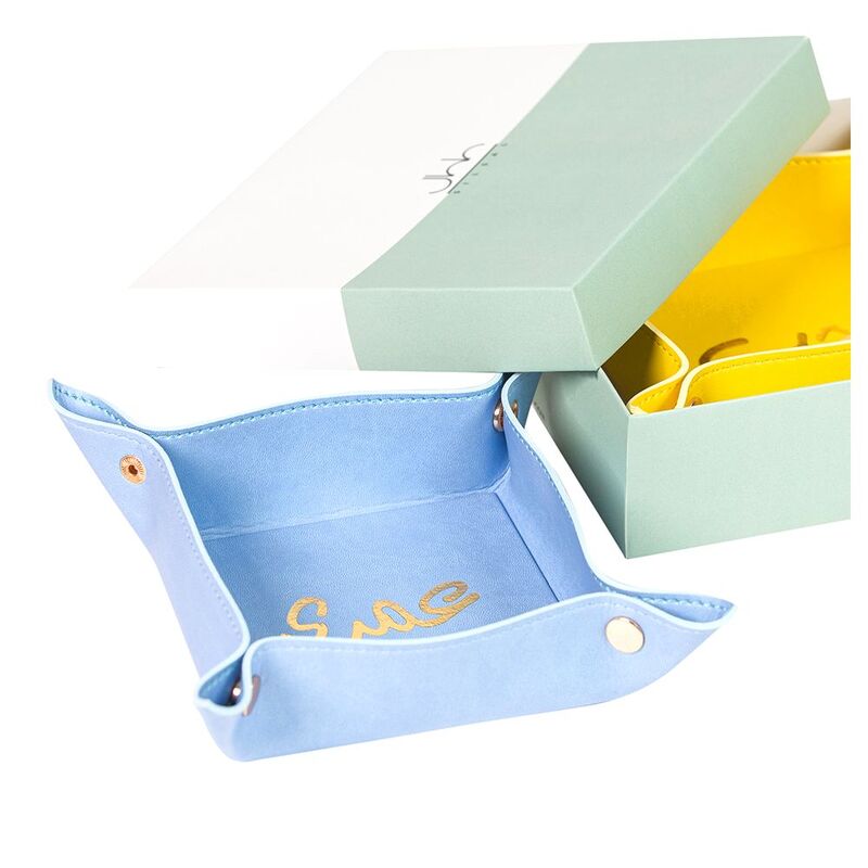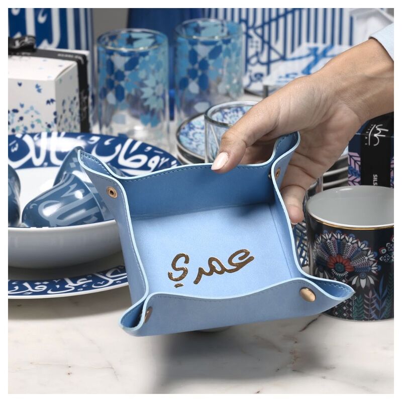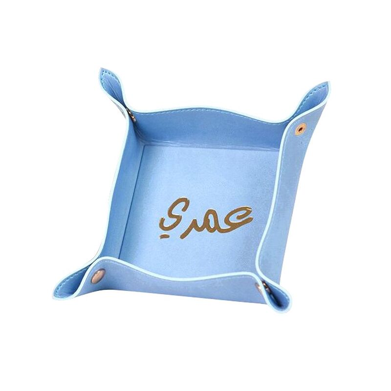 A thoughtful favor or sweet gift, this catchall tray is perfect for holding trinkets, change or jewelry. Expertly crafted from vegan leather, it's decorated with the word "Omri", meaning “My Life”” in gold calligraphy. The perfect addition to your desk or bedside table, it keeps your daily essentials neatly in place.