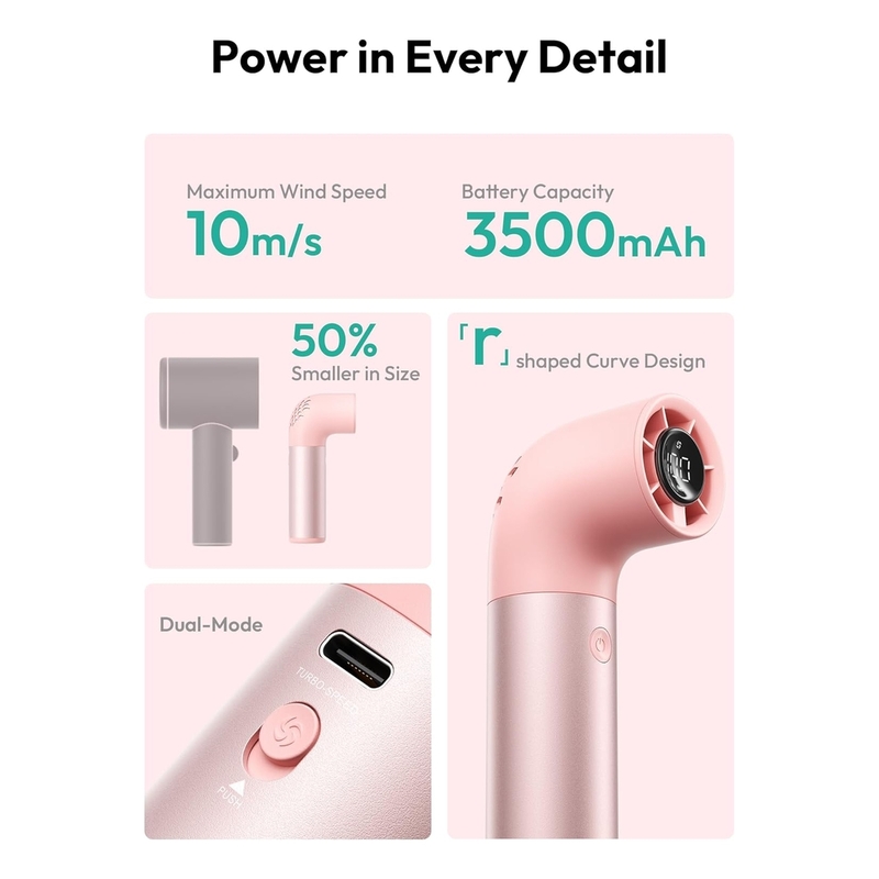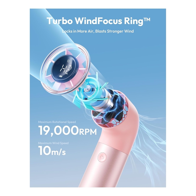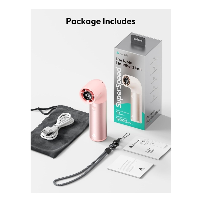 - Aecooly Mini Portable Fan powered by a robust Turbine Brushless Motor offers exceptional cooling performance with a maximum rotation speed of 19,000 RPM and wind speeds up to 11 m/s. It rapidly circulates powerful airflow, providing quick and efficient cooling, whether you're facing intense summer heat or seeking relief after exercise. The strong, invigorating breeze cools down your environment instantly, offering refreshing comfort that cuts through the heat.
