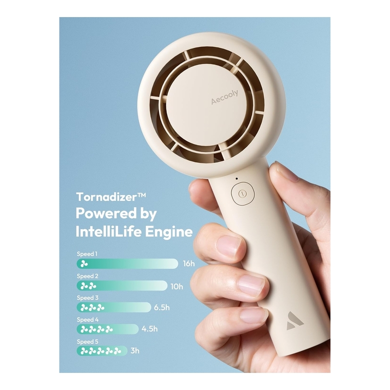 - Aecooly Portable Handheld Fan with 5 different speed options, you can easily adjust the airflow to your preference. Whether you need a gentle breeze on a warm day or a stronger gust to cool down quickly, the fan offers flexibility for all types of situations. Long-press at any gear to turn off.
