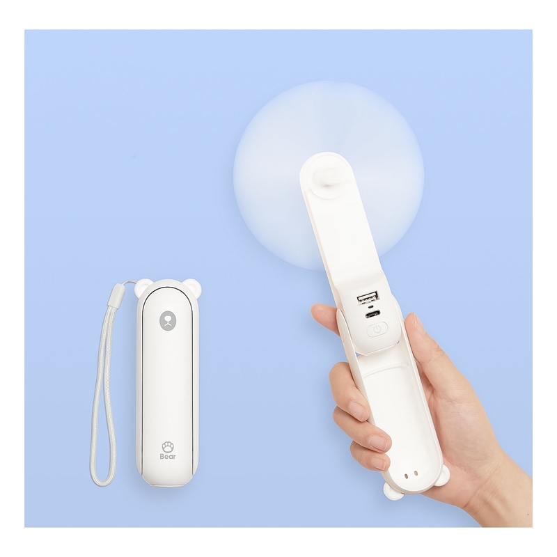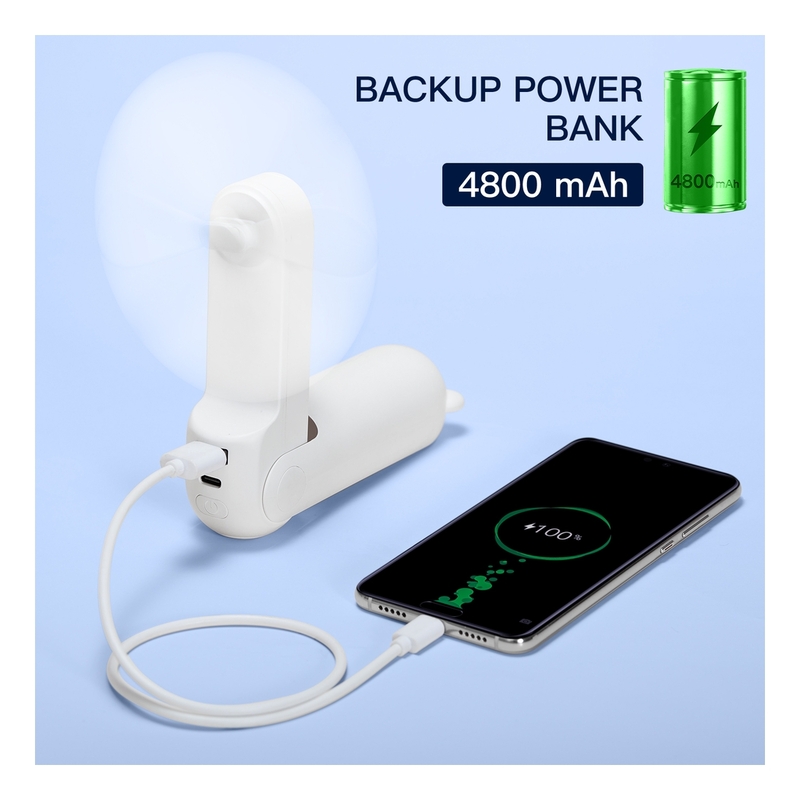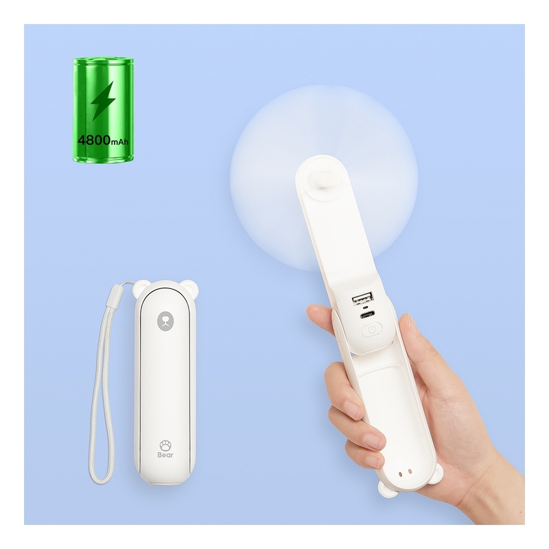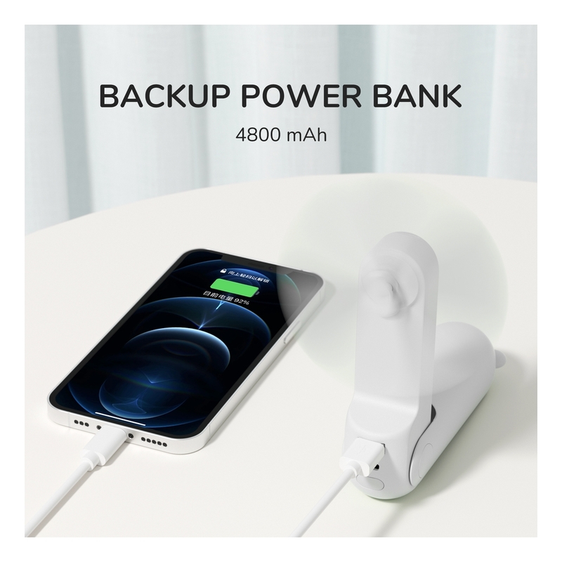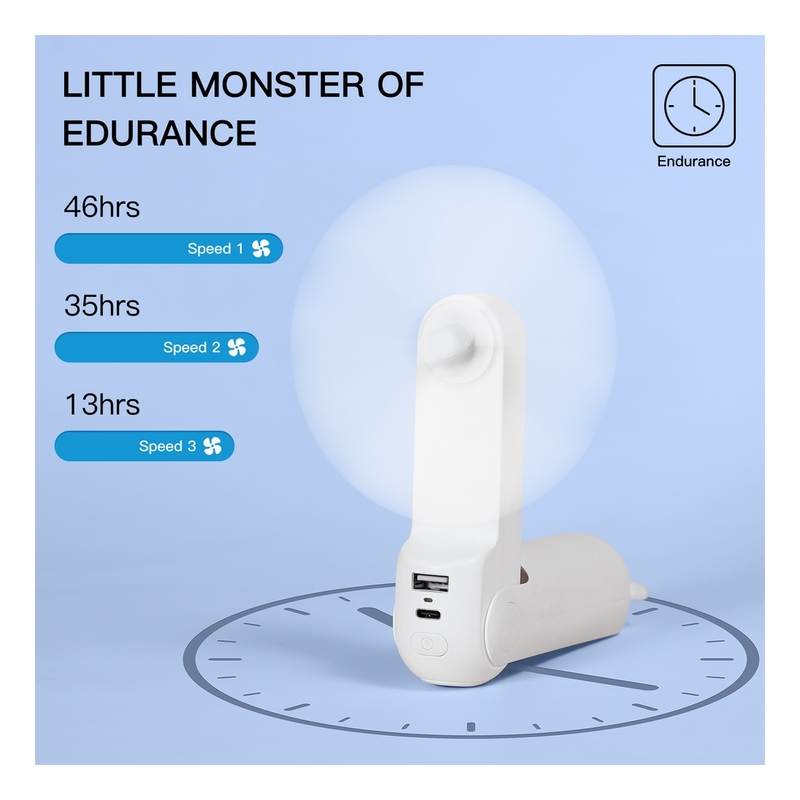 - Power Bank Function: A 5V/1A USB output port makes the mini fan a power bank (4500mAh) in an emergency, supplying power for mobile phones.