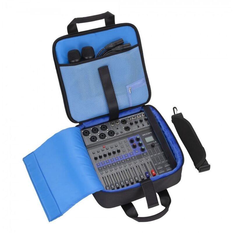 The CBL-8 is semi-hard carrying bag made with EVA (Ethylene-Vinyl Acetate) material. It carries a LiveTrak⢠L-8 as well as their accessories such as power adapter, cables and SD cards, and you can take them comfortably. It has stretch-bands to fix the unit securely and pads protect from damage and shock. And also it comes with a shoulder strap with pads to reduce load of weight.