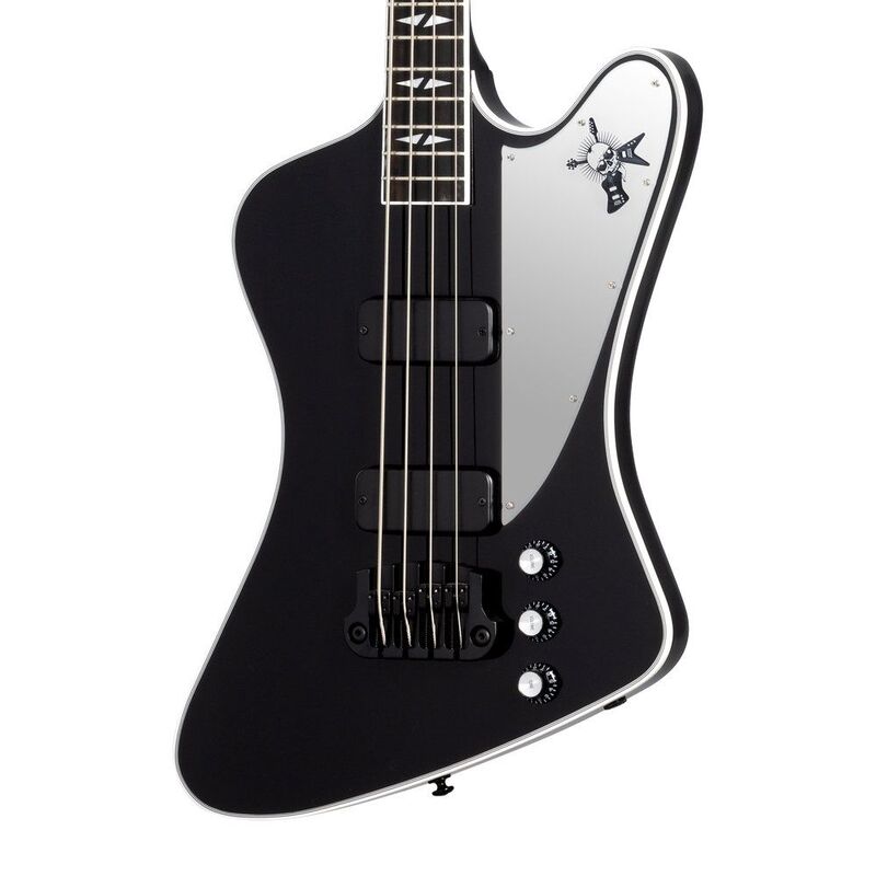 The Gibson Gene Simmons G2 Thunderbird bass guitar reflects the style and sound of the KISS bassist and legendary rock icon. Designed to meet the musical needs of modern bassists, it features the classic Gibson Reverse Thunderbird body and headstock shape. It is voiced with a Lead T-Bird pickup at the bridge and Rhythm T-Bird at the neck, each with individual Volume controls and paired with a master Tone control. Enjoy smooth playing with the rounded profile mahogany neck and ebony fretboard, including pearloid reverse split diamond inlays. A Graph Tech nut and Hipshot Mini-Clover tuners keep the tuning rock solid, while the other end of the strings anchor to a Hipshot bass bridge. The ebony nitrocellulose lacquer finish is paired with black chrome hardware and a Mirror Plex pickguard. A hardshell case is included.