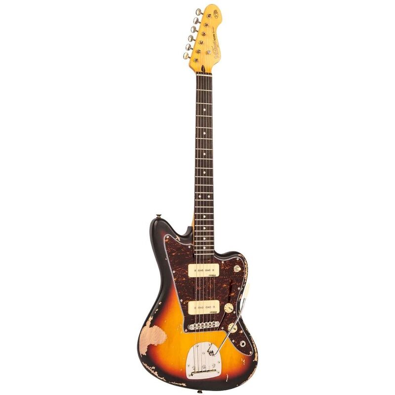The Vintage® ICON™ distressed V65V, available at Sadek Music, carries the unending appeal of the offset solid-bodied electric guitar. Loved by cult followers of this classic, timeless trendsetter, it combines an incredibly authentic worn look that evokes a well-played yet carefully looked-after guitar from the early ’60s. Available in incredibly realistic Distressed Black or Distressed Tobacco Sunburst finishes, every scuff and abrasion on the front, sides, and rear of the body is expertly crafted by Vintage’s skilled luthiers. The Vintage ICON V65V features a traditional tonewood combination with a lightweight alder body and bolt-on maple neck. The worn concept subtly extends to the one-piece neck with a classic Vintage ‘soft C’ profile, while the 22-fret rosewood fingerboard offers excellent note response, superb playability, and outstanding tonal transfer with glassy top end and solid mids.Equipped with a pair of Wilkinson Soapbar single coil pickups, the V65V excels in musical styles often associated with offset guitars — think Indie, Punk, Garage, or Surf. The extra-long arm of the floating offset vibrato is perfect for adding expressive pre- and post-chord bends as well as lead line vibrato while strumming. Fitted with a precision-cut 43mm Graphtech NuBone nut and Wilkinson WJ55 machine heads, the Vintage ICON V65V offers smooth string bending and superb tuning stability. Whether running through low or high wattage amps, in the studio or live on stage, it performs beautifully.FEATURES:Body: Alder body provides resonance, tone and ‘correct weight’ comfort. Bridge: Vintage offset vibrato provides pitch manipulation, superb tuning stability and adjustable intonation for each string.Pickups: Two Wilkinson Soapbar single coil pickups provide fat and articulate cleans and cutting, punchy overdriven tones.Controls: Independent master Volume and Tone pots with three position pickup selector switch. Machine heads: Wilkinson WJ55 machine heads provide simple, effective action for superb tuning stability.Neck: One piece Maple with classic Vintage ‘soft C’ profile for instant comfort, speed, accuracy and great feel.Fingerboard: Rosewood for outstanding tonal transfer, responsiveness and durability with a traditional 10” radius for superb playability and feel.Scale Length: 25.5" / 648mm.Frets: 22 Medium Jumbo profile frets add to comfort, accuracy and overall positive feel of the Vintage V65VBMRSB. Nut: 43mm Graphtech NuBone for smooth and friction-free string bending and tuning.Headstock: Classic Vintage headstock design for balance and visual appeal. The V65™ is an original Vintage® ICON Series guitar designed in the UK by the Vintage® design team.