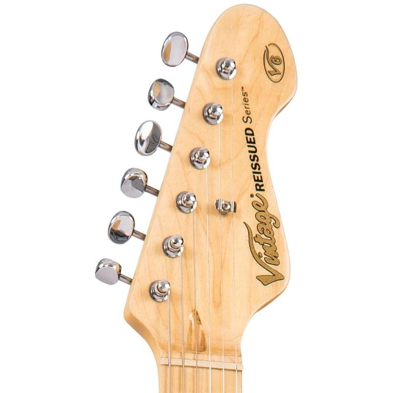 The Vintage ReIssued Series V6HMBB, available at Sadek Music, masterfully blends timeless aesthetics with modern design ingenuity. Loaded with a pair of Wilkinson WOVaS Single Coil pickups, the V6HMBB delivers a perfectly balanced tone — rich mids, articulate lows, and the clarity you'd expect from a classic-style guitar. To take it up a notch, the bridge features a Wilkinson WOHZBb Double Coil pickup, offering high output, boosted harmonics, and the edge needed for powerful high-gain soloing. The Wilkinson vibrato bridge is fitted with a stagger-drilled block that significantly improves intonation and delivers excellent return-to-pitch performance, making it a dream for expressive players. Whether you're on the hunt for your first guitar or your forever instrument, the Vintage ReIssued Series, proudly offered by Sadek Music, delivers tone, style, and reliability in every model. Play on.The Vintage V6, available now at Sadek Music, offers an extraordinarily high level of specification, packing in custom shop-grade features at an exceptional value. At the heart of the V6 is the revered Wilkinson WVC vibrato system, built to original specifications. It features authentic bent steel saddles for that unmistakable vintage sparkle and tone, precision-machined pivot points for total return-to-pitch accuracy, and a stagger-drilled sustain block to eliminate string hang-ups. An adjustable, vintage-bend push-in arm completes this finely-tuned vibrato system. Tone authenticity continues with a matched and calibrated set of Wilkinson Alnico V pickups, including a reverse-wound/reverse-polarity middle pickup for enhanced clarity, reduced hum, and dynamic response. These pickups also feature vintage-style chamfered-edge pole pieces for added tonal character. With a classic control layout — one volume, two tone knobs, and a 5-way lever switch — the Vintage V6 is configured for maximum tonal versatility, delivering even response and smooth output across the board. If you're looking for a vintage-inspired guitar with modern playability and premium appointments, the Vintage V6 from Sadek Music is an ideal choice.FEATURESBody: American Alder body provides resonance, tone and ‘correct weight’ comfort, enhanced with correctly radiused contoured body.Vibrato: The Wilkinson WVC vibrato bridge featured on the Vintage V6 is a masterpiece of detail. Positive location, 6 screw design provides return to pitch accuracy; perpendicular bend, high grade steel saddles enhance tonality and ‘snap’. Ground base plate corner provides authentic looks. Stagger drilled cast block significantly enhances return to pitch accuracy and classic vintage tone. The ‘push-in’ delrin-bushed arm with variable tension provides the arm feel that suits your style.Pickups: Pair of Wilkinson WOVaS Single Coils provide a range of traditional tones whilst a WOHZBb Double Coil adds increased power in the bridge pickup.Controls: Single master Volume control with Tone control 1 for the neck and middle pickup, with 'Custom Mod' Tone control 2 for bridge pickup. Five-way selector switch Machine heads: Wilkinson WJ55 E-Z-Lok machine heads provide simple, effective action for maximum tuning stability. Neck: Hard rock Maple Skunk Stripe with classic Vintage ‘soft C’ profile for instant comfort, speed, accuracy and great feel. Fingerboard: Traditional 10" radius fingerboard provides positive feel and superior playability. Scale Length: 25.5" / 648mm. Frets: 22 Medium profile frets add to comfort, accuracy and overall positive feel of the Vintage V6. Nut: 43mm GraphTech® nut, smooth and friction free. Headstock: Classic Vintage headstock design for balance and visual appeal. The V6™ is an original Vintage® ReIssued Series guitar designed in the UK by the Vintage® design team.