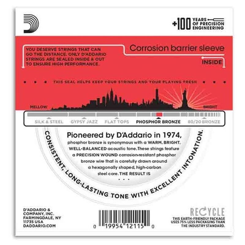 Phosphor Bronze was introduced to string making by D'Addario in 1974 and has become synonymous with warm, bright, and well balanced acoustic tone. D'Addario Phosphor Bronze strings are precision wound with corrosion resistant phosphor bronze onto a carefully drawn, hexagonally shaped, high carbon steel core. The result is long lasting, bright sounding tone with excellent intonation.