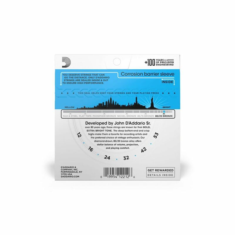 80/20 Bronze are our brightest acoustic strings, made to give your guitar an unparalleled shine. These bold sounding strings were developed by John D'Addario Sr. and guitar maker John D'Angelico in the 1930s, and have been beloved for their sparkling, trebly tone ever since. Made with a high carbon steel core and 80/20 Bronze wrap wire, 80/20 acoustic strings offer remarkable depth, along with rich, bright harmonics, and powerful projection. 12-53 Light gauge strings are our most popular acoustic gauge, providing a nice balance of playability and tone.