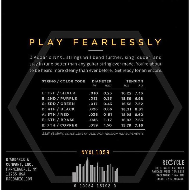 NYXLs will bend farther, sing louder, and stay in tune better than any string you’ve played before. As our premium uncoated electric string, NYXLs offer higher break strength, enhanced tuning stability, and accentuated mid-range frequency response, providing more presence and crunch to cut through the mix. Made with a NY Steel core, premium nickel-plated steel wrap wire, and Fusion Twist technology, NYXL electric guitar strings are tough enough and versatile enough to handle anything. Made for 7-string guitars, this 10-59 Regular Light gauge set takes our most popular gauge and adds an additional bass string.