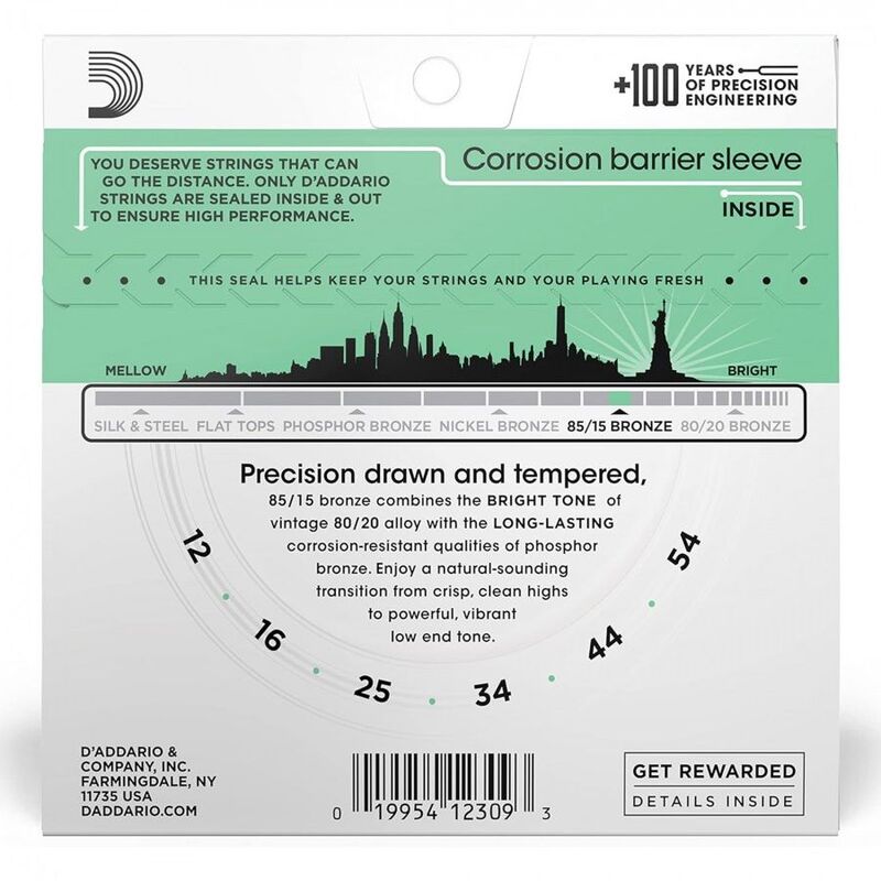 Made in USA by D'Addario, New York..Medium Light, ideal balance of tone, projection and playability. Bright, long lasting acoustic tone, ideal for all musical styles..Environmentally friendly, corrosion resistant packaging for strings that are always fresh. Made in the U.S.A. for the highest quality and performance..String Gauges: Plain Steel .012, .016, Bronze Wound .025, .034, .044, .054