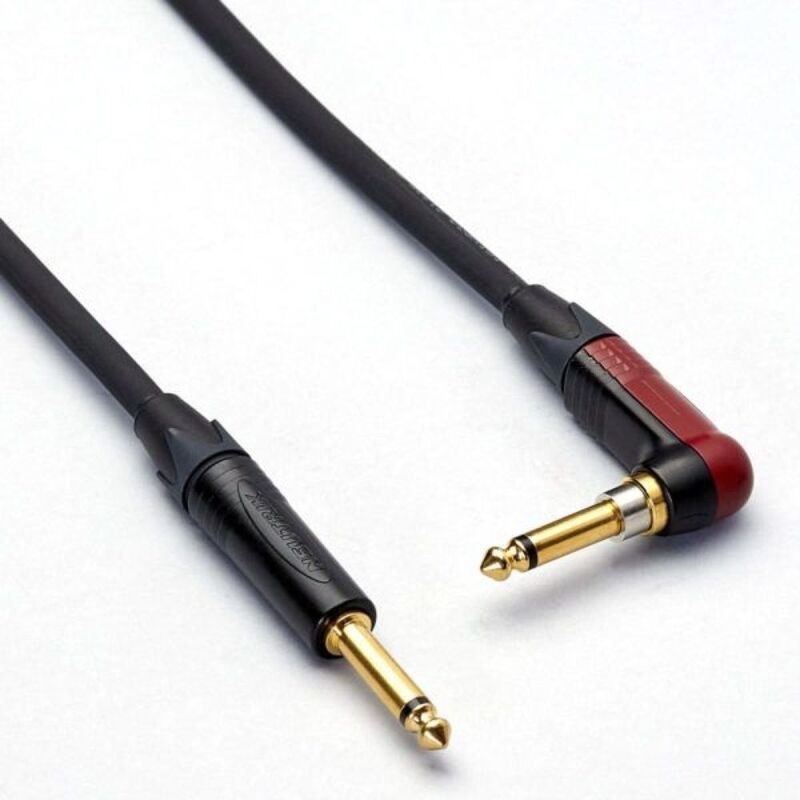 Shielded cable Professional series for music instruments, made with one 6,3 mm. mono Neutrik (R) jack and one 6,3 mm. angled SILENT Neutrik (R) jack. Gold-plated connectors. Length 6 m.