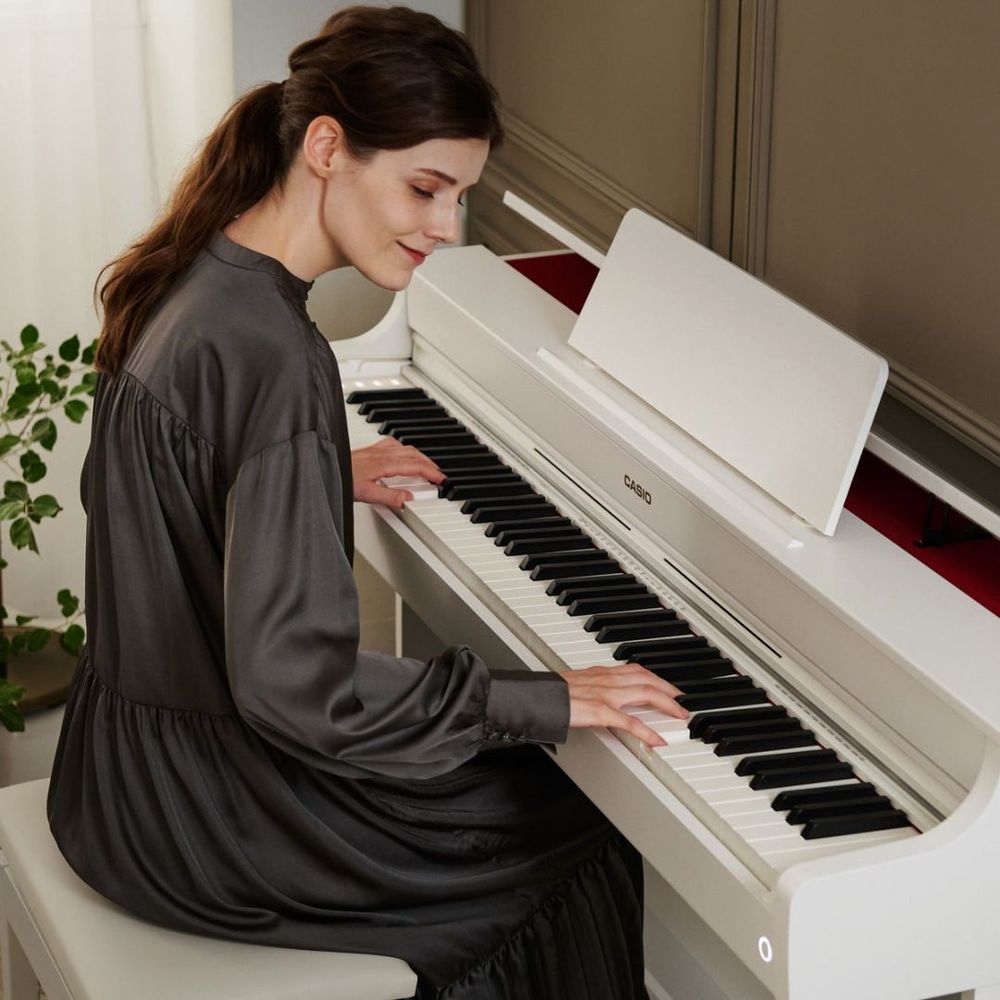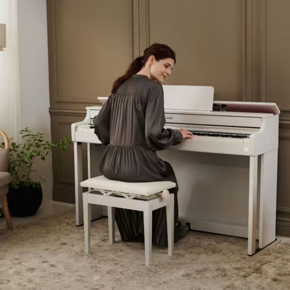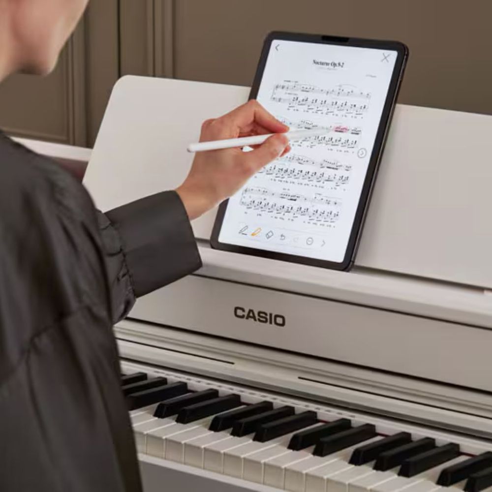 The Casio CELVIANO AP-300 blends classical elegance with modern innovation, powered by the Multi-Dimensional Morphing AiR Sound Source for rich, expressive tones. Its Smart Scaled Hammer Action Keyboard with textured ebony/ivory keys delivers authentic touch and nuanced playability. A 2-channel speaker system with Volume Sync EQ ensures immersive resonance at any volume, while Sound Mode and Headphone Mode enhance both performance and practice. Three pedals replicate grand piano control, offering precision and stability. With wireless MIDI & Audio connectivity and the CASIO MUSIC SPACE app, the AP-300 expands creative possibilities. Compact, stylish, and expressive, it’s the perfect entry into the piano world.