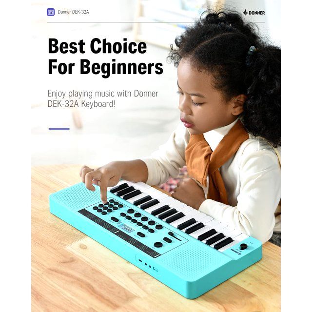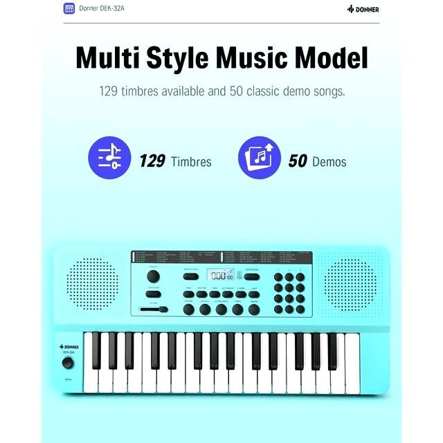 - Rich timbre & demo-song: Donner DEK-32A portable electronic keyboard has 129 timbres available, and 50 classic repertoire etudes for practice. Rich playability and entertainment can stimulate beginners' musical talent.