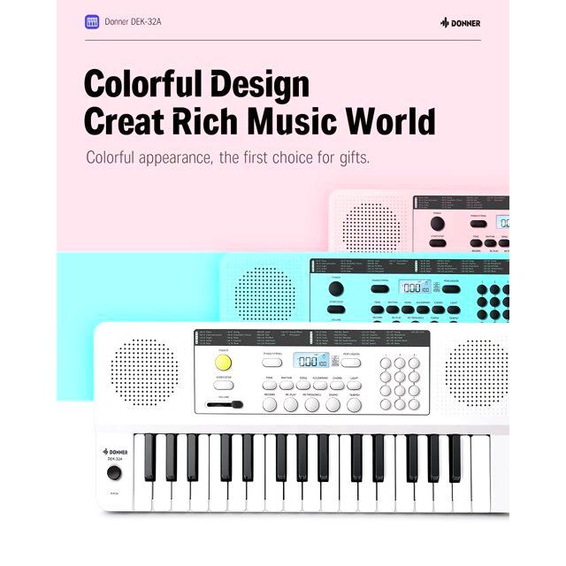 - Colorful & Fun Gift: DEK-32A electronic keyboard is a fun gift for beginners. It has 3 colors, which you can choose according to your preferences. And it has a fantastic look and has been designed with fun illustrations on the package. We also presented stickers. In addition, the packaging design of the aircraft box enhances the unpacking experience and the sense of surprise is full.