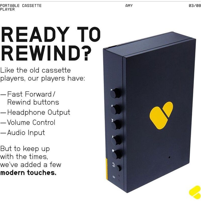 We Are Rewind is a modern walkman, with up to 12 hours rechargeable battery life, Bluetooth 5.1 transmission for your headphones or portable speaker, a 3.5mm line input for recording and a full aluminium stylish case.