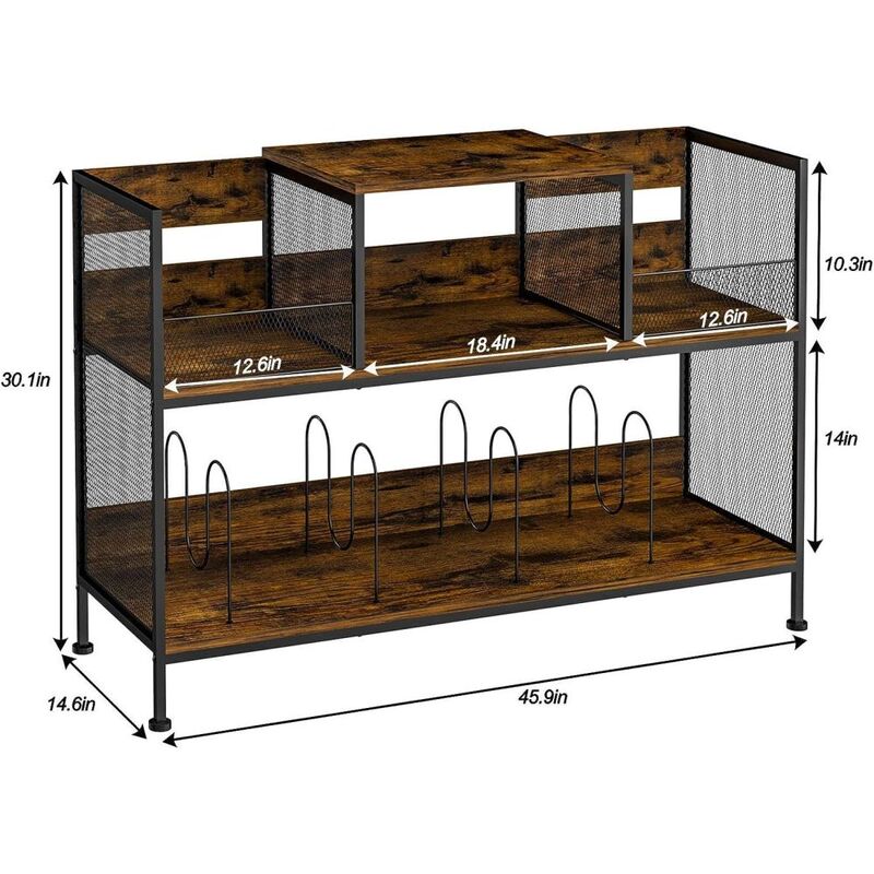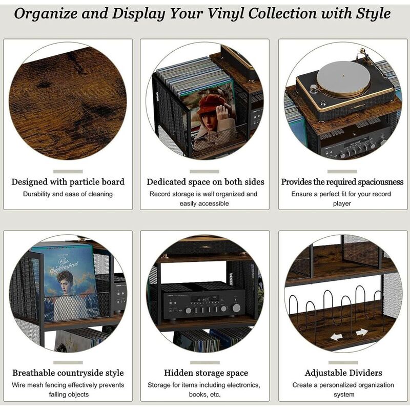 The vinyl record storage stand is designed with brown-grain mid-century -style particle board and solid iron tubing for durability and ease of cleaning. It adds a unique charm to display your precious vinyl collection.