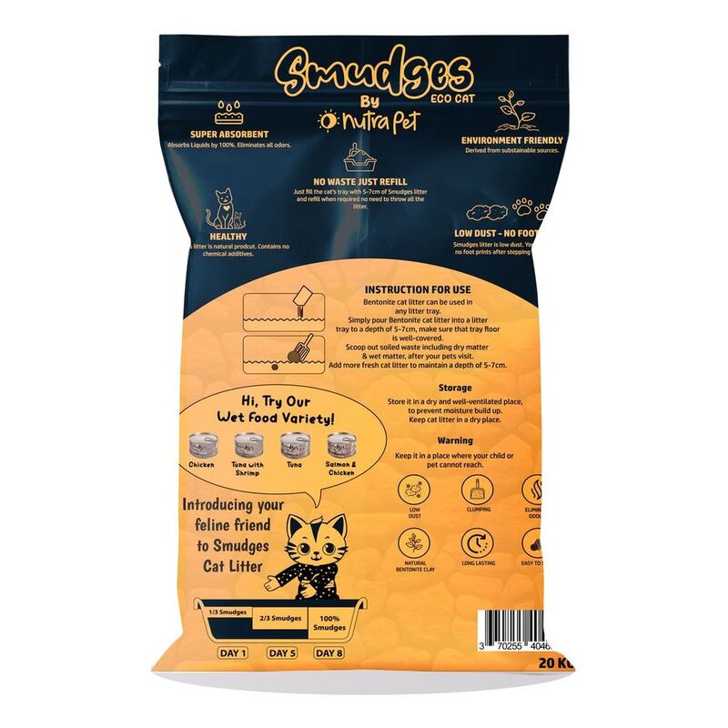 Keep your cat's litter box clean and fresh with Smudges Ecocat Bentonite Clumping Cat Litter. Made from 100% natural bentonite clay, this unscented litter offers superior clumping for quick and easy cleaning. Its high absorbency locks in moisture and minimizes odors without added fragrances. Ideal for households with multiple cats, Smudges Ecocat litter is dust-free, gentle on paws, and provides excellent odor control. This eco-friendly product is both pet and planet-friendly, offering a natural solution for everyday litter needs.