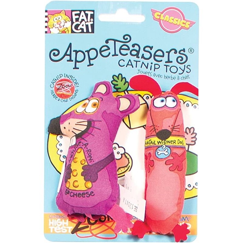 The perfect bite-sized toy, Appeteasers will make every hour Happy Hour! Just the right size for airborne fun kitties just can't get enough of them. Get 'em while they're hot! WOW! 2 toys per package! Choose from Mouse-A-Roni Cheese, tail Wiener Dog, Teenie Sardini or collect 'em all! Satisfyingly stuffed with our mouth-watering Zoom Around the Room, organic catnip. Assorted type cannot be specified, unfortunately. Please allow us to choose the type for you.