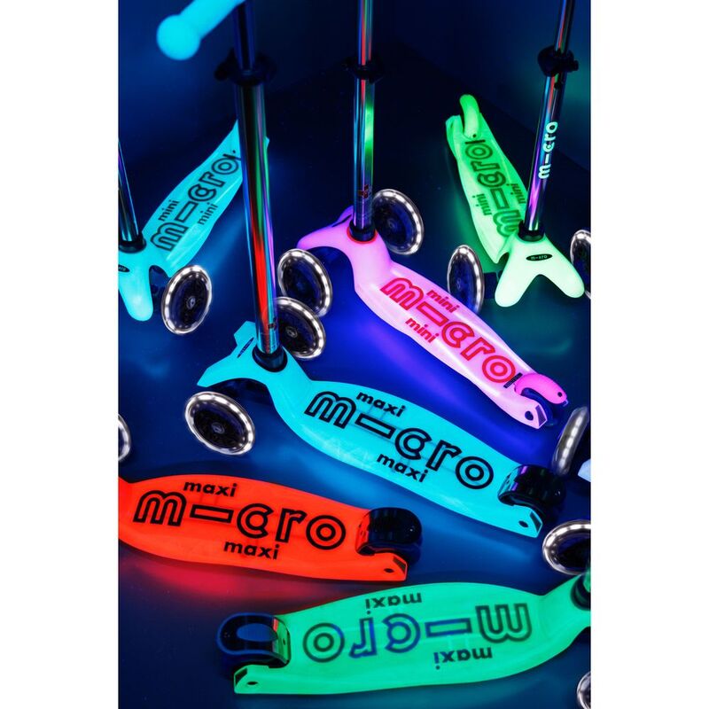 The Maxi Micro Deluxe Glow LED scooter is the ultimate companion for your child's daily adventures! Experience how your child's ride becomes an exciting adventure thanks to the enchanting glow-in-the-dark elements. From the elegant deck to the ergonomic grips and handlebar logo, every detail of this scooter is designed to add a touch of magic to each ride. The Maxi Micro Deluxe Glow LED Scooter is powered by the natural energy of sunlight or artificial UV light. Just let it soak up the sun during the day and it's ready to light up the night with its radiant glow.But the magic doesn't end there! With its innovative LED wheels, this scooter brings extra fun to any ride. Whether your child is cruising around the neighborhood or whizzing through the park, the mesmerizing play of light will capture their imagination and turn heads wherever they go. The Maxi Micro Deluxe Glow LED Scooter not only offers an exciting experience, but also places great emphasis on safety. With its robust construction and reliable braking system, you can rest assured that your child is protected as they explore the world around them.
