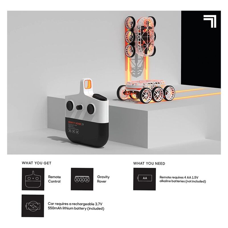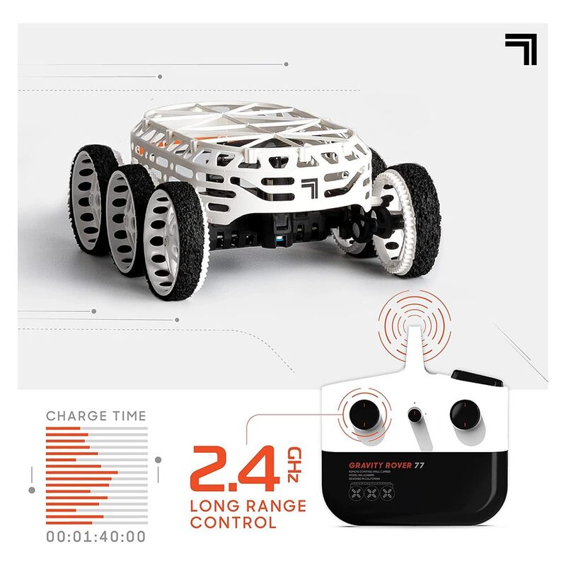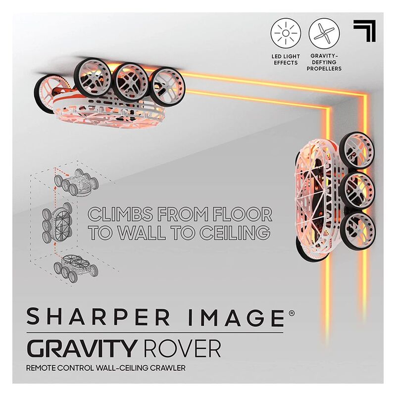 Gravity Rover climbs from floor to walls and even onto the ceiling! Downforce propellers and oversized wheels help the rover drive up any surface and cling to the ceiling. 2.4 GHz remote control allows for long-range control. Gravity Rover can move in multiple directions, so you get to decide where it goes! You'll never lose sight of the Gravity Rover with under-glow LED lights to help you see where it's going. Great for play at any time of day! Kids will love driving the remote-controlled car on floors, walls, and the ceiling! Perfect for winter play, rainy days, or anytime kids are inside! Gravity Rover even contains a rechargeable lithium battery so that you never have to stop playing!