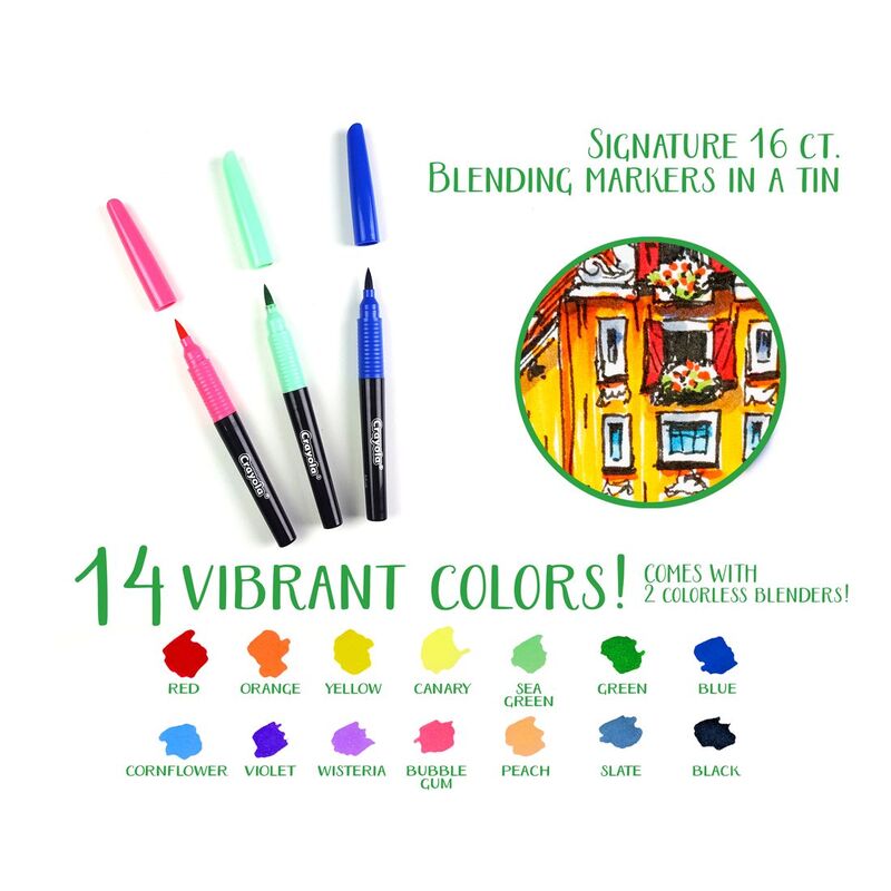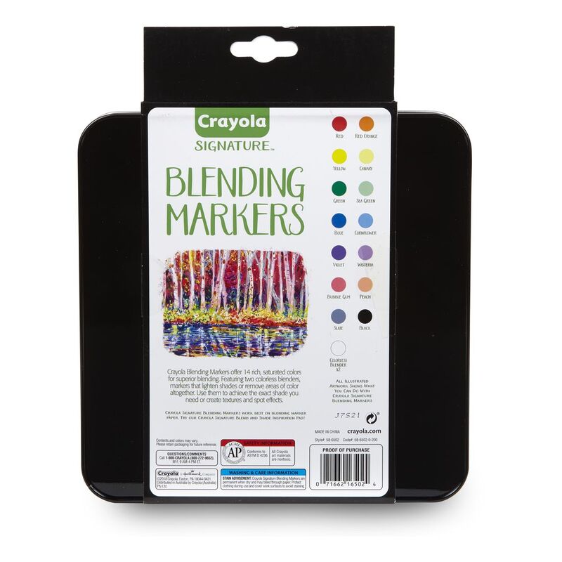 Crayola signature blending markers provide great creative versatility in coloring and art projects. Sketch, draw, add texture, and blend colors for unique outcomes. A great technique for taking your adult coloring to the next level! Includes 14 markers in brilliant colors (7 colors in light and dark variations), 2 colorless blending markers and a decorative storage tin.