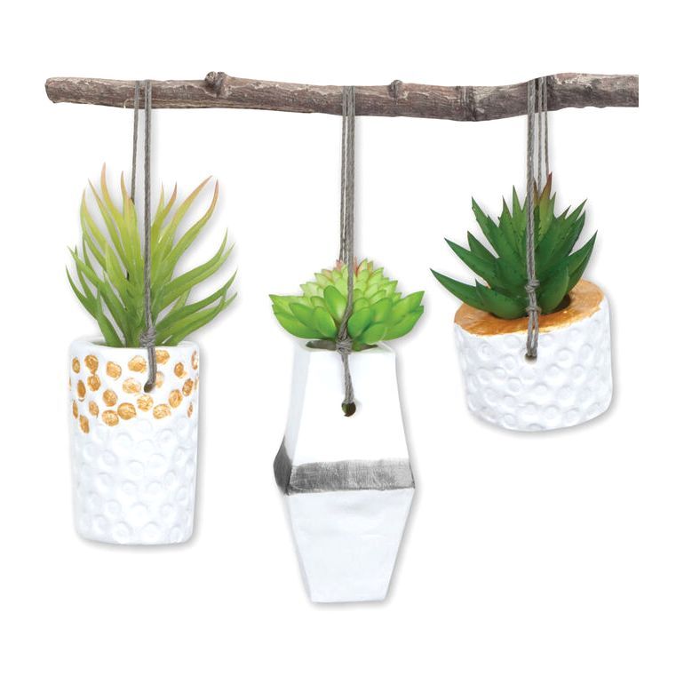 This 6x10x2 inch package contains one guide, three 4oz packets of air-dry, three .41oz tubes of acrylic paint, three 6 foot nylon string bundles, three faux succulents and one paint brush. Non-toxic.