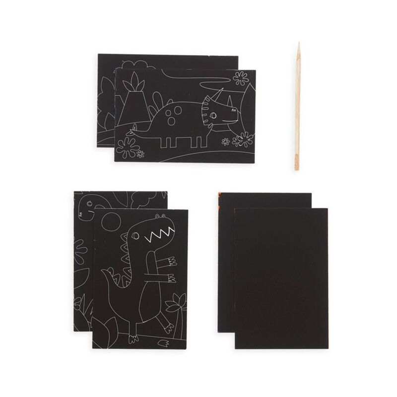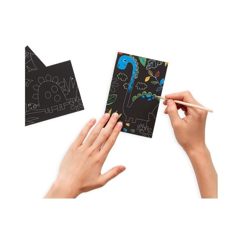Get busy scratching because dinosaur adventures are waiting! These fun dinosaur themed scratch art cards are filled with easy-to-follow guidelines to reveal the dino inspired rainbow artwork. Sized for on-the-go fun at 4 x 6 inches these mini scratch art kits for kids are great for travel. Each kit not only has 4 cute dinosaur illustrated cards but 2 blank cards for creating your own designs, all revealing a rainbow of color using the included wooden stylus.