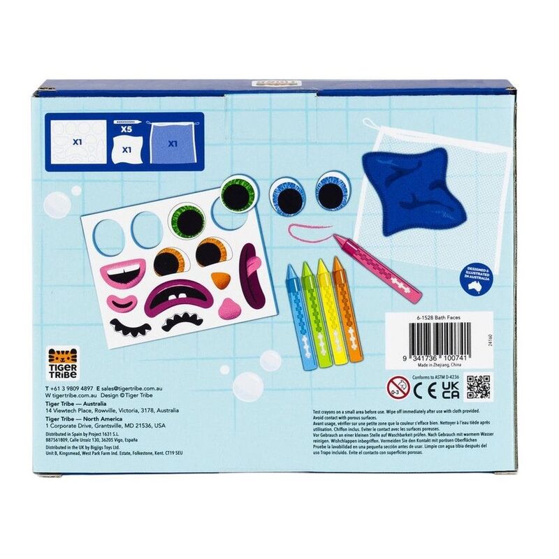 • Each set includes 14x EVA foam face pieces, 5x bath crayons, 1x wiping cloth, 1x net bag for pack up/storage