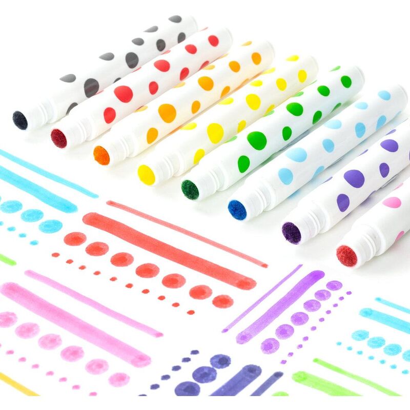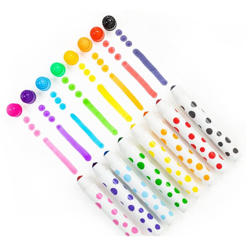 A super fun set of eight high quality, marker-style dot paints. Designed to make painting clean and easy, simply twist off the caps and let the fun begin. No cups or brushes to set up or wash and no drips or spills. Kids will love experimenting with the different effects that can be achieved with the round sponge tip applicator - from fun dotty spots to blending and layering and broad colour sweeps too. The perfect tool for creative art sessions.