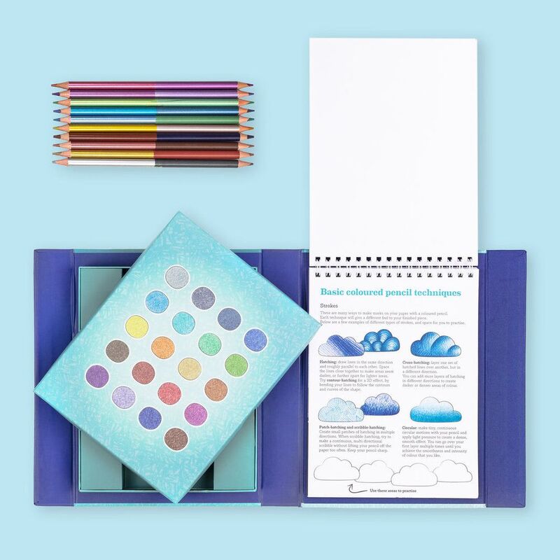 A shimmery set that introduces a variety of techniques to teach kids the skills required to really level-up their art. With metallic, artist-quality pencils, this set takes keen little creatives on a celestial journey, with illustrations of potions, crystals, magical scenes and dragon scales.