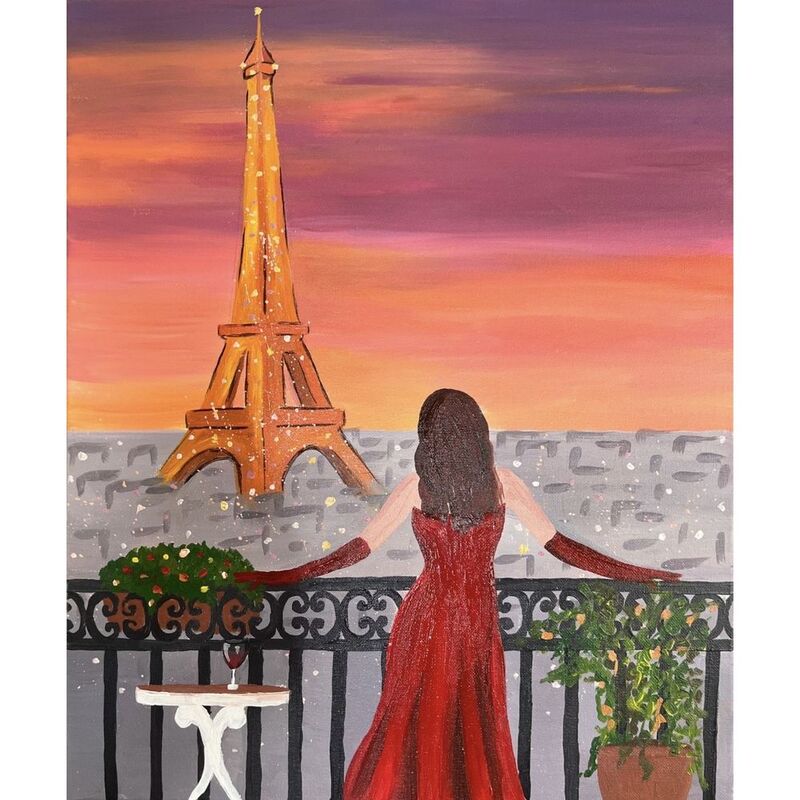 In "An Evening in Paris," a lady in a flowing red dress gazes at the glowing Eiffel Tower as the sun sets, casting a warm, golden hue across the sky. This moment captures the essence of romance and possibility, symbolising both longing and hope. The vibrant red of her dress mirrors her passion and dreams, while the iconic tower stands as a beacon of love and inspiration. This painting invites you to embrace your own aspirations and find beauty in fleeting moments, reminding us that each sunset holds the promise of a new dawn.