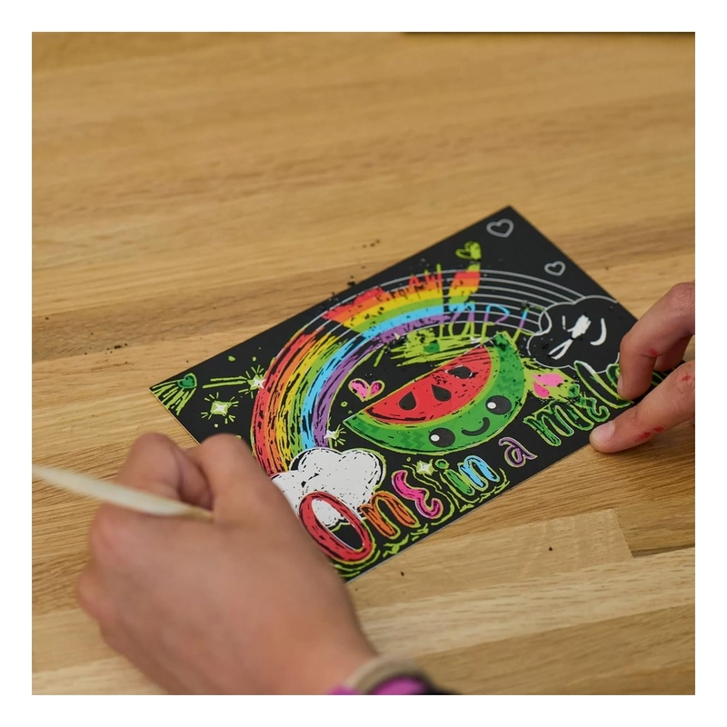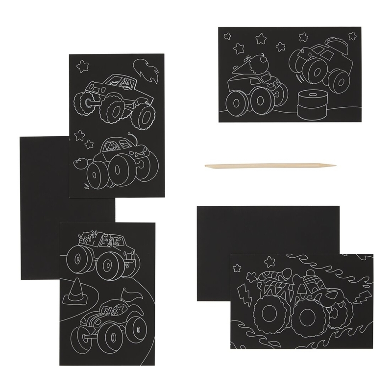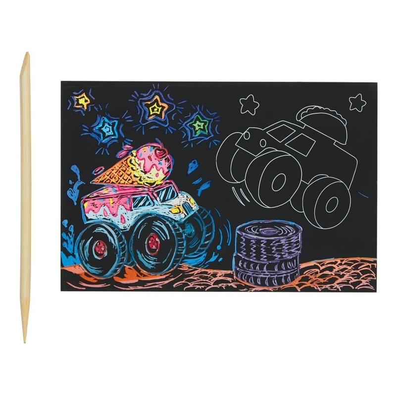 Monster trucks with monster personalities make this scratch art kit a wheely awesome gift! The set includes four different four-wheeled illustrations just waiting to be revealed by the wooden stylus. Two blank scratch cards are also included, because the best monster trucks are the ones you create from your imagination.