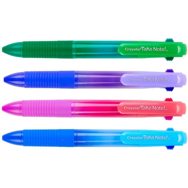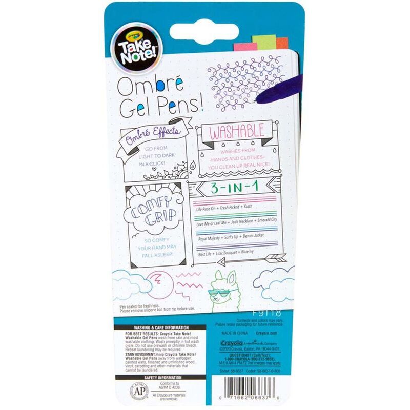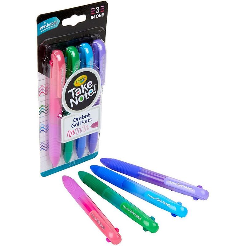Crayola Take Note Ombre Washable Gel Pens go from light to dark in a click! Each of the 4 Gel Pens in this set features 3 different shades so you can create gradient, shading effects with just one pen! Add ombre effects in journals, notebooks or any writing projects. And the inks wash clean from skin and clothing so there’s no worry. Take Note items are fun and functional note-taking supplies that are perfect for classroom, office, and more. Ideal for teens & adults.