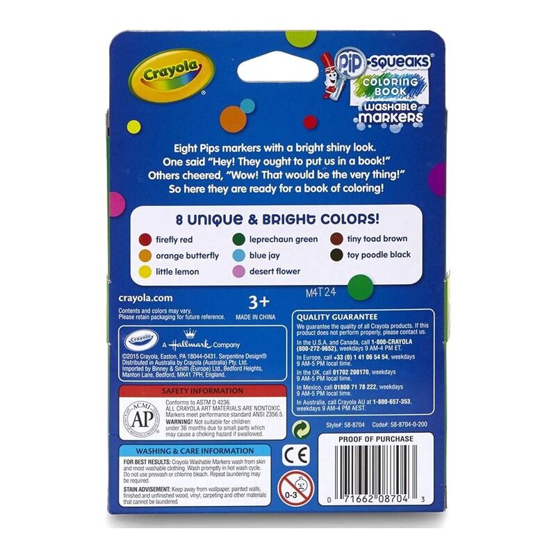 Endearing Pip-Squeaks Markers are small in size but BIG in colour! The easy-to-hold short barrels are scaled to match little hands and the ink is our special washable formula! Features 8 unique colours - not the traditional "school" palette of colours Each pack includes 8 short washable colouring book markers