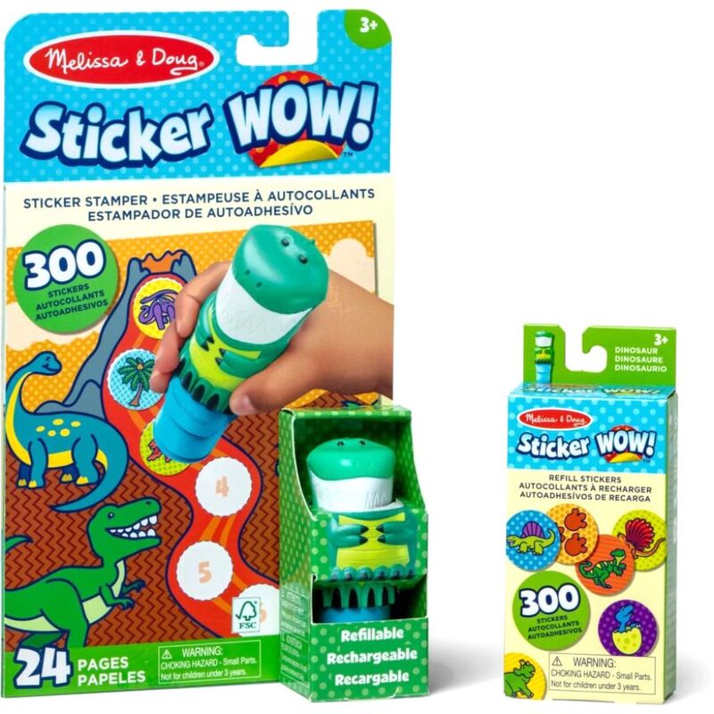 Melissa & Doug Sticker WOW!™ is a whole new way to play with stickers! Let the adorable, collectible Olive the Dinosaur stamp, stamp, stamp its way through 24 pages of fun-filled, prehistoric-themed counting, matching, and search-and-find activities. The refillable sticker stamper comes pre-loaded with a sticker stack of 300 assorted stickers – with 100 unique designs in every stack, each sticker is a surprise! Plus, this set is bundled with a refill pack of 200 EXTRA prehistoric-themed stickers (compatible with any Sticker WOW!™ sticker stamper) and an additional mini prehistoric-themed activity pad for even more Sticker WOW!™ fun. Stickers are not reusable, but are easy to remove if necessary. Fill in the activity pages and use for creative art projects, such as bookmarks, posters, cards, and more. Easy-to-remove stickers and the convenient on-the-go format with built-in sticker stamper storage makes Sticker WOW!™ a great mess-free travel activity. Sticker WOW!™ (patent pending) promotes fine motor skills, encourages creative play, and it’s satisfying, fidget fun!