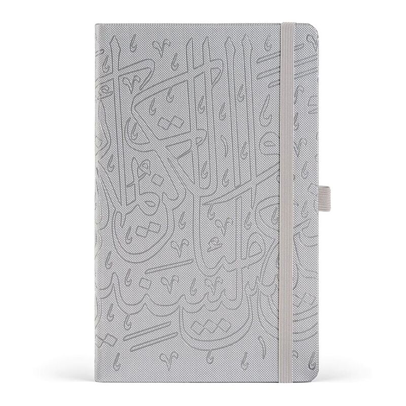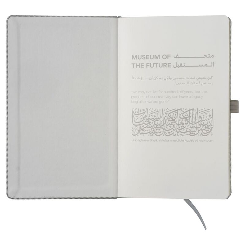 Inspiring calligraphy illustrating We may not live for hundreds of years, but the products of our creativity can last even longer is printed around this A5 notebook.