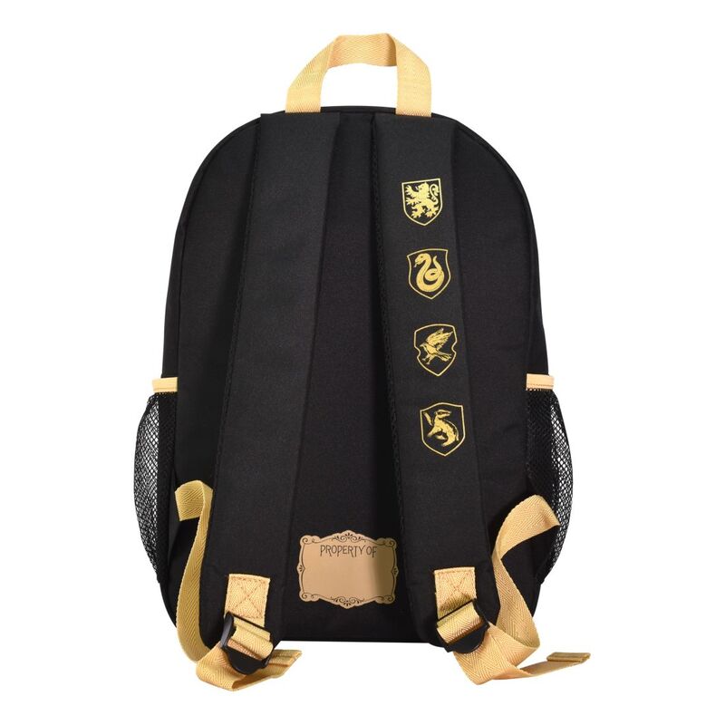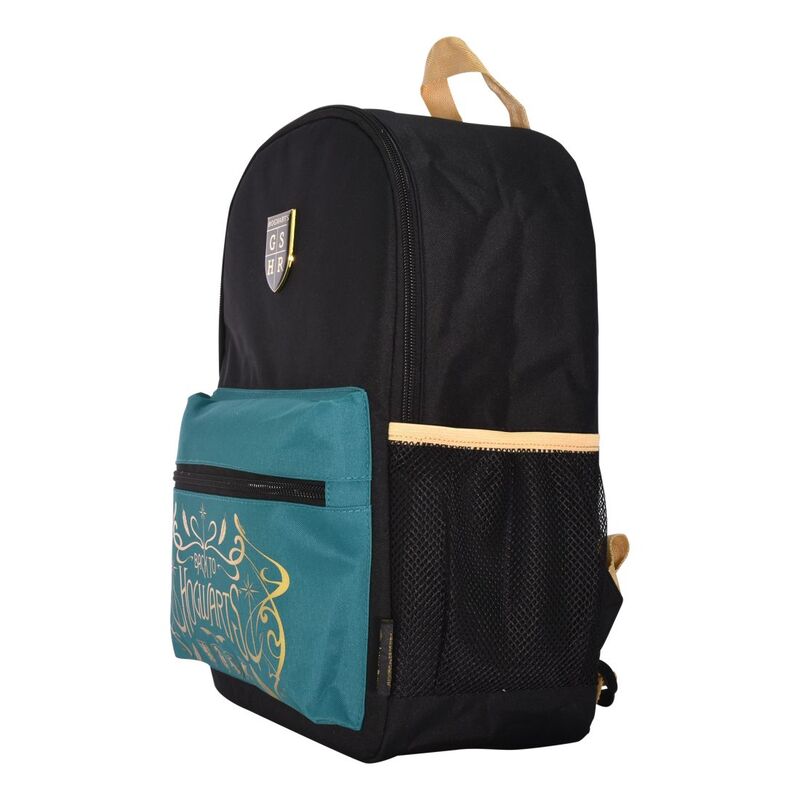 Large sized Black Nylon Backpack with Teal front zipped pocket, Side meshed pockets, Camel accents and Coat Hook with Enamel Badge detail. Golden Hogwarts printing on front pocket.
