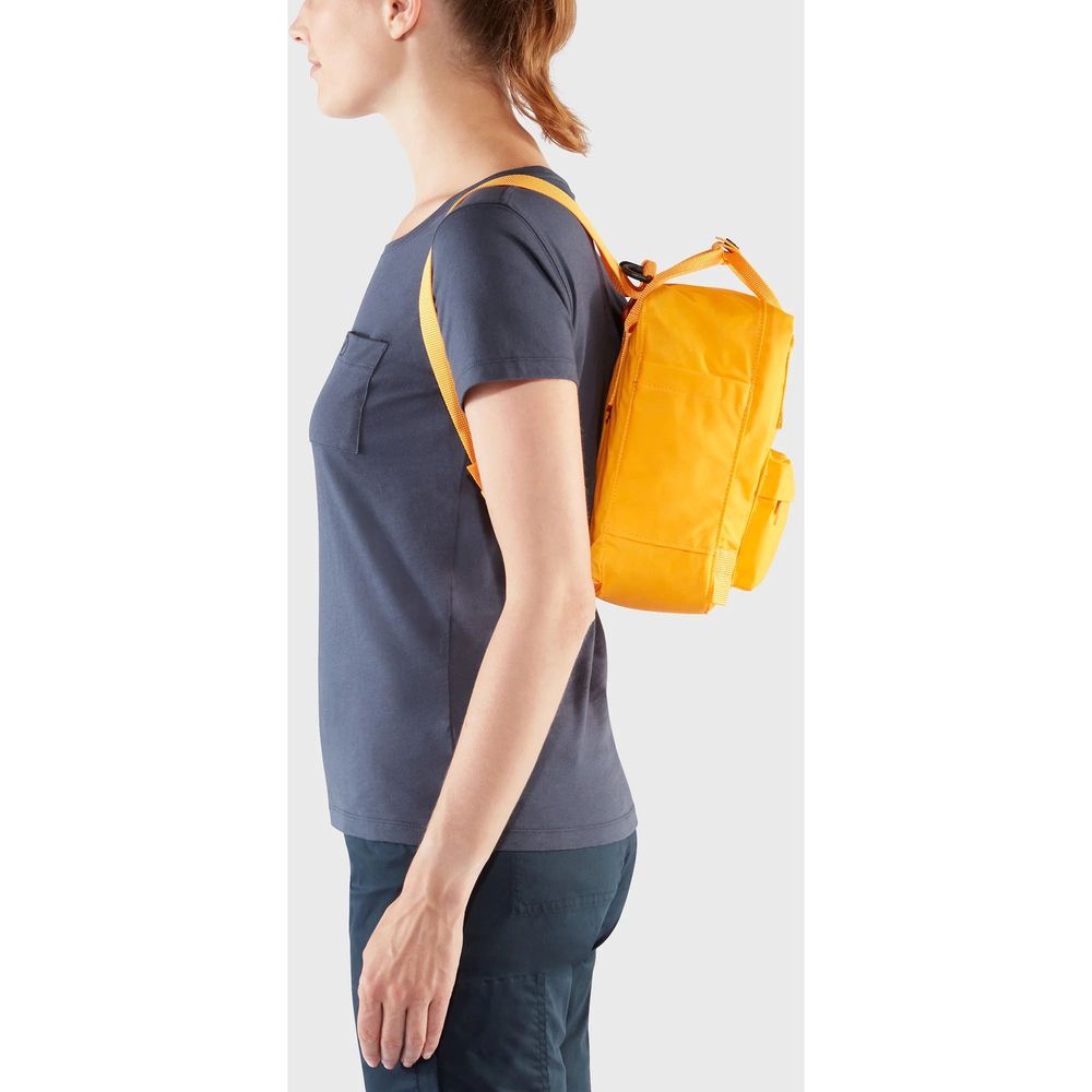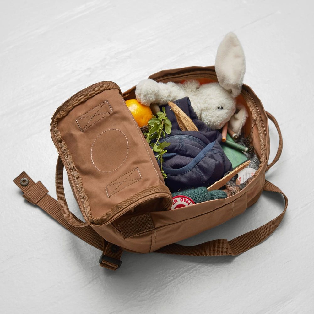 Kånken was created in 1978 to help prevent back problems among Swedish school children and, since then, has become one of Fjällräven's most appreciated products. The Mini-version is suitable for small children as well as for full grown adults who are looking for a small backpack. It is perfect for carrying a change of clothes for preschool or food on an outing, and as a smart everyday bag for books, water bottles, fruit and more. The shoulder straps are long and adjustable and fit both small and big backs. They can be fastened with a clasp so that they are not in the way when at their tightest. The material is hard-wearing, lightweight Vinylon F fabric that is able to withstand dirt and wetness. The main compartment has a large zipped opening, which makes it easy to pack and unpack. Two flat side pockets and a zipped pocket on the front. The included PE foam seat cushion is stored in the interior back pocket and also prevents the contents in the main compartment from poking against your back. Handles at the top and slender, adjustable shoulder straps. The logo on the front is reflective. It also has an address label inside the main compartment.
