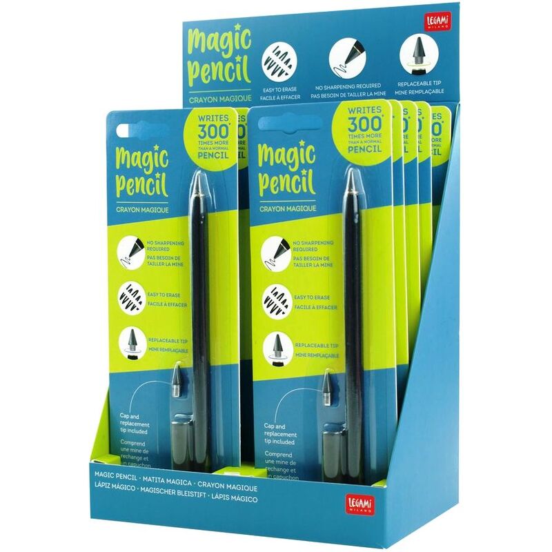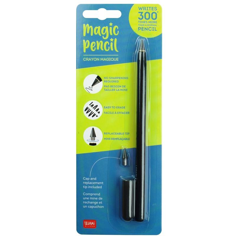Forget about sharpening your pencil: you no longer need to worry about blunt nibs thanks to the Legami Magic Pencil. Each tip supplied lasts 159 times as long as a traditional wooden pencil, so you can write for 15,900 metres! Includes a plastic cap, replaceable graphite and metal tip and a metal insert to prevent the pencil from rolling on flat surfaces.