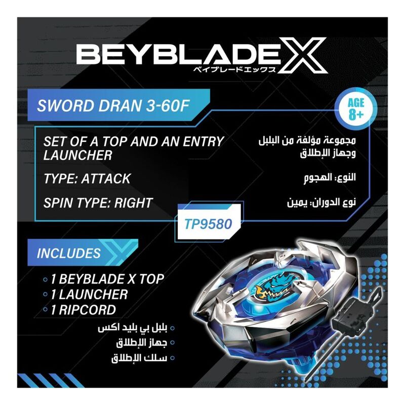 Dive into the next generation of Beyblade battles with Beyblade X and unleash the full power of Sword Dran 3-60F! This high-speed, right-spin Attack Type top is designed for epic collisions and powerful bursts. The Starter Pack comes with everything you need to jump into battle, including the Sword Dran 3-60F top and a right-spin Entry Launcher. Get ready to prove your skills and dominate the Bey stadium!