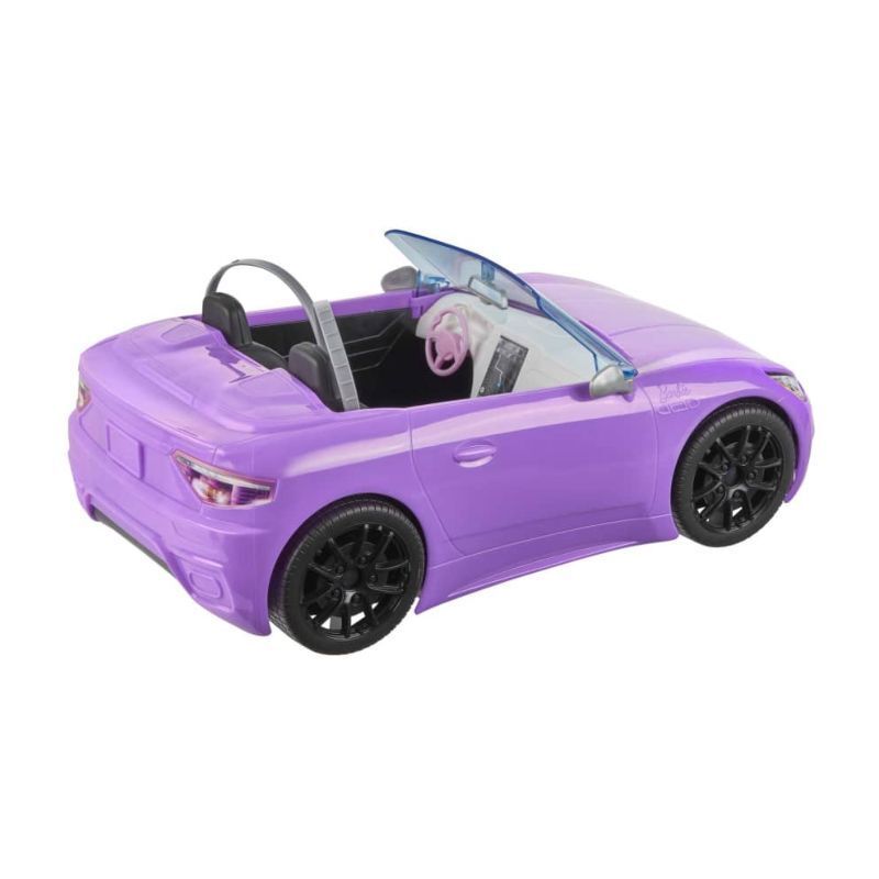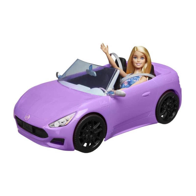 Kids can hit the road to storytelling fun with Barbie doll and her purple convertible vehicle! This doll and vehicle playset features a stylish, open-top car with a sporty shape, seating for two and realistic details, like a matte black grille and wheels, seatbelts and silvery accents. Fun touches with signature Barbie style include a personalized license plate and Barbie silhouette hood emblem. In a trendy dress with palm leaf print and stylish white sandals, Barbie doll is ready for any adventure kids can dream up.