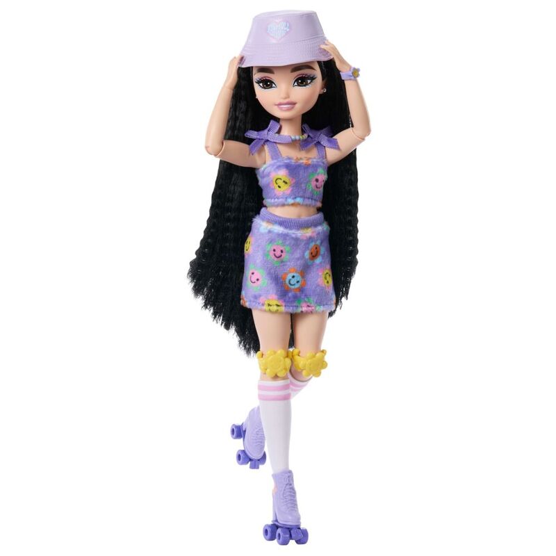 - The doll is posable and is wearing removable fashions, like her furry, flower-patterned tank top and skirt set, with her long white socks featuring pink stripes and her matching purple roller skates with flower details!