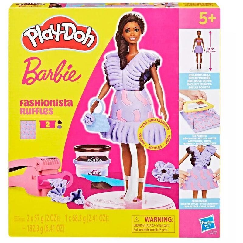 Create super cute styles with the Fashionista Ruffles set! It's easy and fun to make Play-Doh Barbie doll clothing with this arts and crafts kit. Just place the doll on the stand, use the Play-Doh Pattern sheet and cutters to cut Barbie dresses, and dress her up in the most creative ways imaginable. Give her 2 different Play-Doh hairstyles with the short and long hair molds, or kids can make their own by hand. Add Barbie doll accessories like a purse and shoes to complete her look. Keep the imaginative play going with 2 cans of Play-Doh modeling compound to add even more details. Give a fabulously fashionable gift for kids who love Barbie playsets and Play-Doh toys!