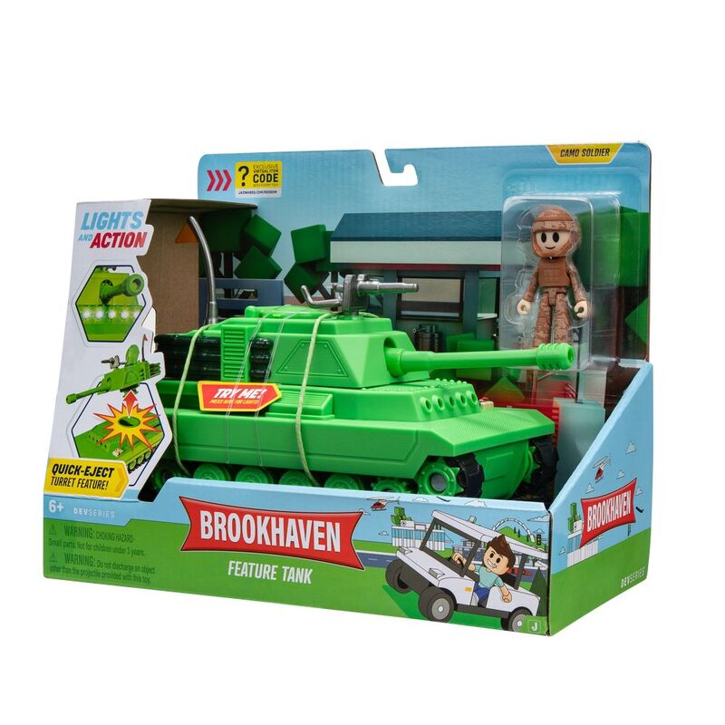 Barrel down the block with the Brookhaven Feature Tank. Featuring working tank treads and a rotating turret cannon, this 7.5-inch vehicle is ready to patrol the neighborhood. It also includes a 2.75-inch mix-and-match figure of Camo Soldier to drive the tank and, when things get really wild, the turret can eject on demand. Pack also includes a special Collectors Checklist as well as an Exclusive Virtual Item Code that unlocks a Tank Hat for your avatar.