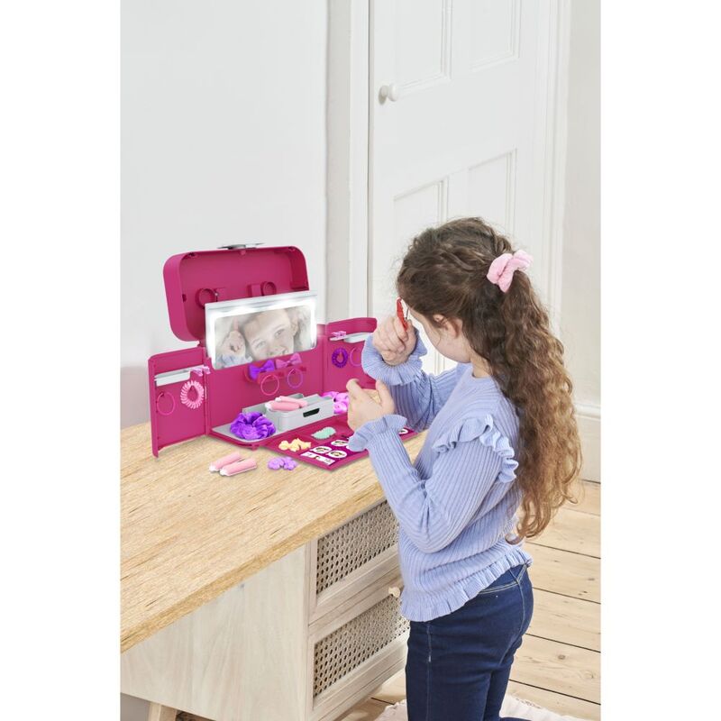 Foldable pink and silver styling case that includes a built-in mirror, double-sided styling cards and 25+ hair accessories. compatible with other styling toys in the dyson range. requires 3 x AAA batteries (not included). suitable for ages 3+