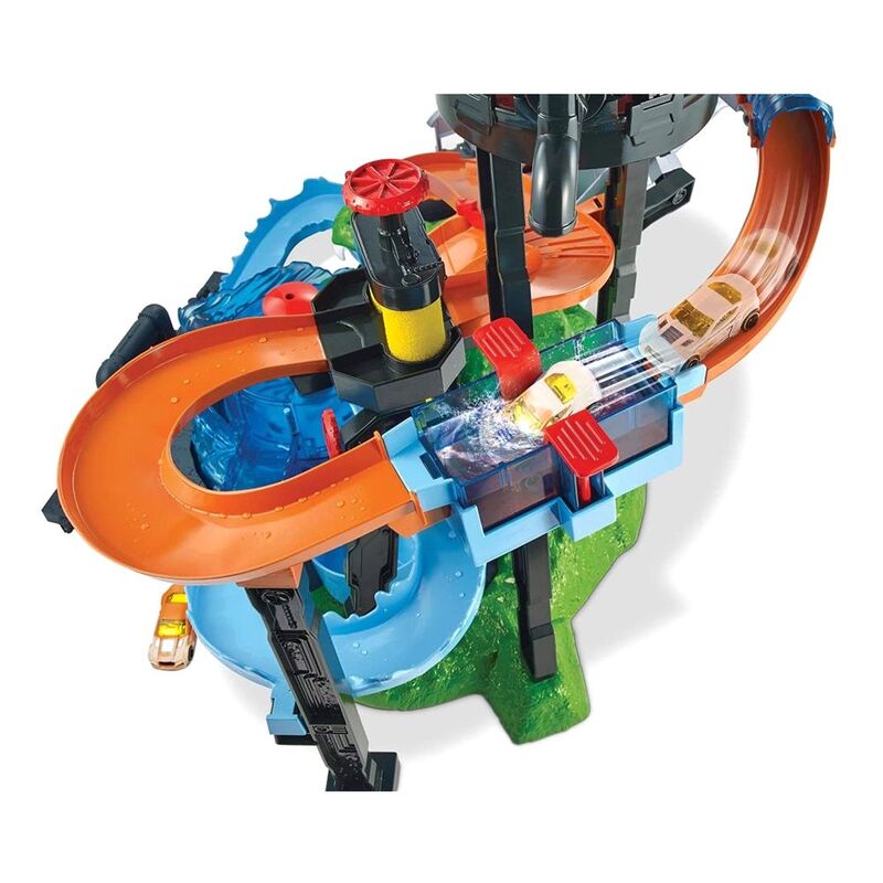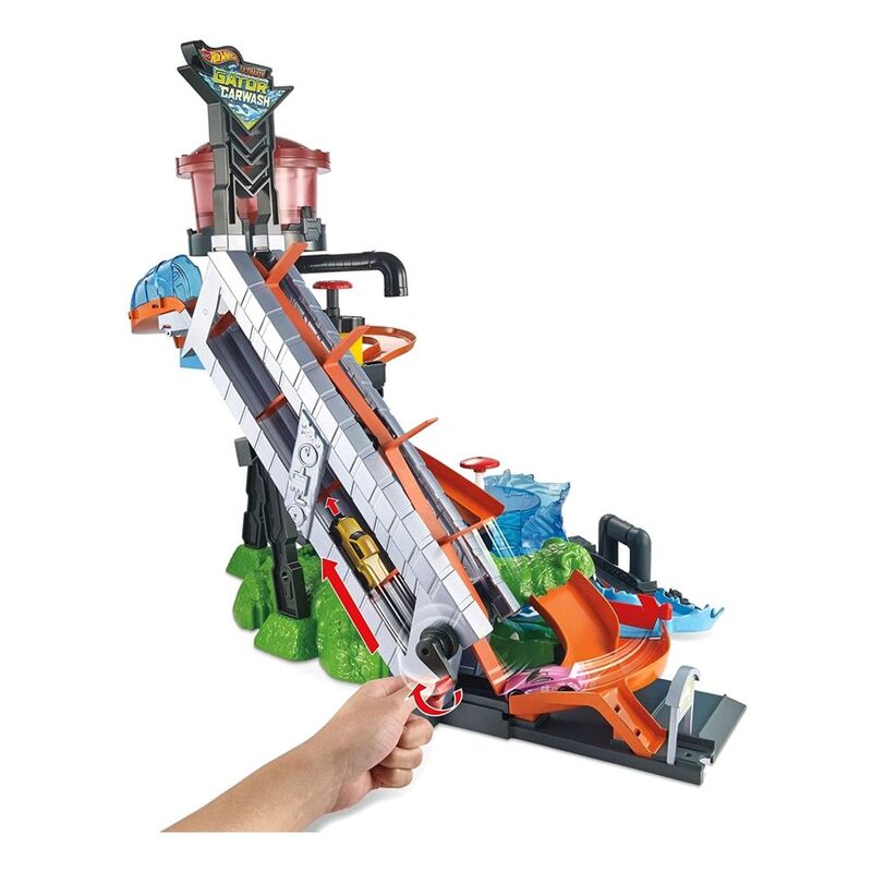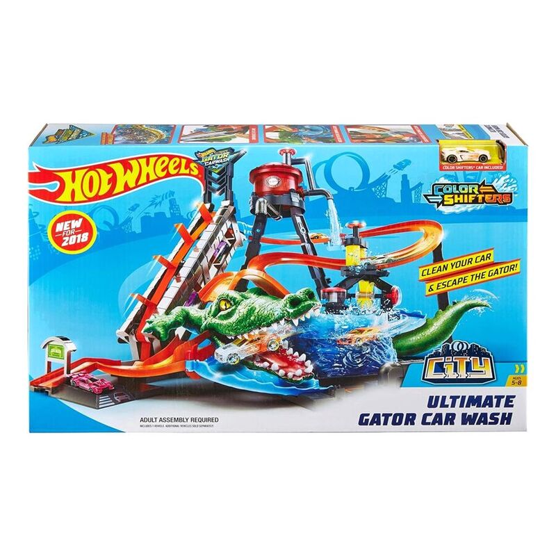 The Hot Wheels Ultimate Gator Car Wash provides hours of storytelling fun with sensory water play and magical color change transformations! Try to escape the swirling whirlpool without getting chomped by the gigantic gator! Kids can start their car wash adventure by sending their cars up the massive crank elevator. Turn the knob on the water tower to drench your car watch it magically change color! Drive through the crazy track and through the push-around-play brushes and rollers of the car wash before taking one final dunk in the whirlpool chamber where your car magically changes color again! Ignite kids' imagination as you try to escape the whirlpool and get past the gator's massive jaws and on to your next heroic adventure. This exciting water-park style play set features a manual crank elevator, crazy track, water tower, whirlpool dunk tank, and 1 Color Shifters car. The play set has multiple connections points to connect to other Hot Wheels sets for a customizable world of track and play.